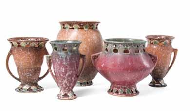 549* Five Roseville Pottery Vases, in the Ferella pattern, four of handled form, each with a pierced rim and foot on a mottled ground, one with original foil label. Height of tallest 8 inches. Property from the Estate of Ms. Jacqueline Kuznicki, Chicago, Illinois $700-900