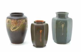 669* A Roseville Pottery Vase, in the Rosecraft Hexagon pattern, of hexagonal form with a matte glaze, together with an Eichwald jardinière with floral decoration and a vase of tapering form with foliate and floral decoration. Height of first 6 inches. Property from the Estate of Marvin and Margaret Katz, Naples, Florida $100-200 670* A Collection of Three Roseville Pottery Vases, two in the Rosecraft Hexagon pattern, each of hexagonal form, the third in the Rosecraft Vintage pattern, of baluster form, each with stamped R mark to base. Height of tallest 5 1/4 inches. Property from the Estate of Ms. Jacqueline Kuznicki, Chicago, Illinois $300-500