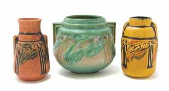 644* Two Roseville Pottery Vases, each in the Wincraft pattern, one in a blue glaze, the other in a yellow brown glaze, numbered 228-15. Height 15 3/4 inches. Property from the Estate of Ms. Jacqueline Kuznicki, Chicago, Illinois $200-400 645* Three Roseville Pottery Vases, each in the Wincraft pattern, of flattened trumpet form, each numbered 287-12, marked Roseville USA. Height 12 1/4 inches. Property from the Estate of Ms. Jacqueline Kuznicki, Chicago, Illinois $200-400