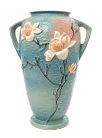590* A Roseville Pottery Vase, in the Lily pattern, of handled baluster form with a blue ground, numbered 929-15, marked Roseville. Height 15 3/4 inches. Property from the Estate of Ms. Jacqueline Kuznicki, Chicago, Illinois $150-250
