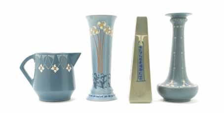 655* A Roseville Pottery Vase, in the Wisteria pattern, of handled bottle form with a yellow glaze, retaining an original foil label. Height 15 1/2 inches. Property from the Estate of Ms. Jacqueline Kuznicki, Chicago, Illinois $800-1,200 656* A Roseville Pottery Vase, in the Wisteria pattern, of handled bottle form with a blue glaze. Height 15 1/2 inches. Property from the Estate of Ms. Jacqueline Kuznicki, Chicago, Illinois $800-1,200