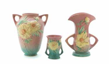 607* Three Roseville Pottery Vases, each in the Peony pattern, of various forms with double handles, with a pink ground, numbered 57-4, 62-8, 63-8, each marked Roseville USA. Height of tallest 8 1/4 inches. Property from the Estate of Ms. Jacqueline Kuznicki, Chicago, Illinois $150-250