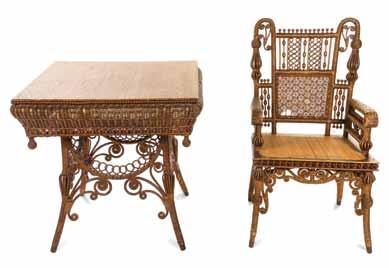 395 Charles Bryson (American, 20th Century) Dancer with a Tambourine pastel signed Bryson and dated (lower right) 53 1/8 x 29 1/4 inches. $800-1,200 396 An American Rattan Parlor Suite comprising two rocking chairs, an armchair, a square top table and a settee. Width of settee 42 inches. $1,000-2,000