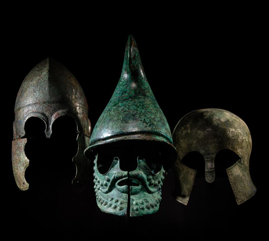Elsewhere, the collection turns from the face to the body in armor: a Greek Bronze Phrygian Helmet, a Greek TinnedBronze Chalcidian Helmet, and a Greek Bronze Corinthian Helmet. Each is an object of defense, but also of identity. In the ancient Mediterranean, armor was never merely practical; it stood at the meeting point of danger, honor, and selfpresentation. These helmets remind us that the ancients did not separate the question of how to live from the question of what was worth defending. They are metaphors, even now, for the “good death” as the Greeks understood it: not death sought for its own sake, but a life made meaningful through courage, duty, and purpose.
