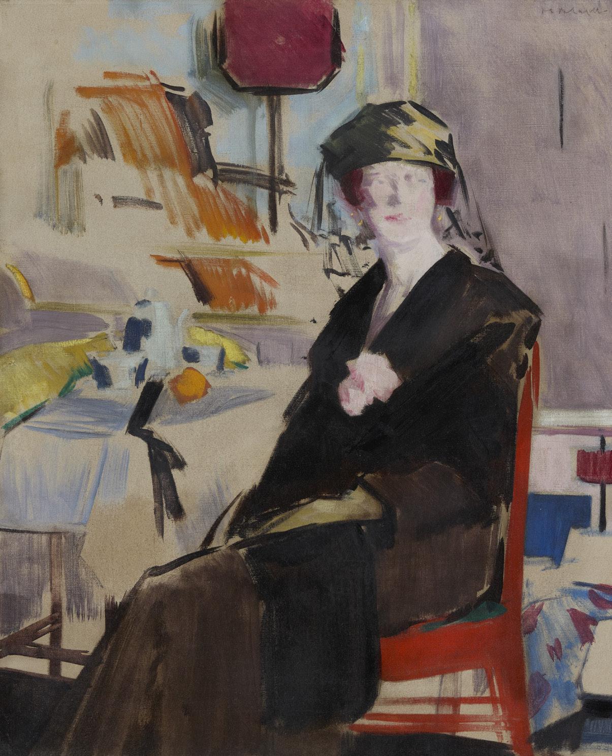 form, teased the viewer with hints of description, and used areas of brilliant color to create rhythm across the image. Interior: The Lady in Black was acquired by the present owner in New York in 1966. It epitomizes why Cadell is one of Scotland’s most revered artists, and why his work is so highly sought after for public and private collections alike.