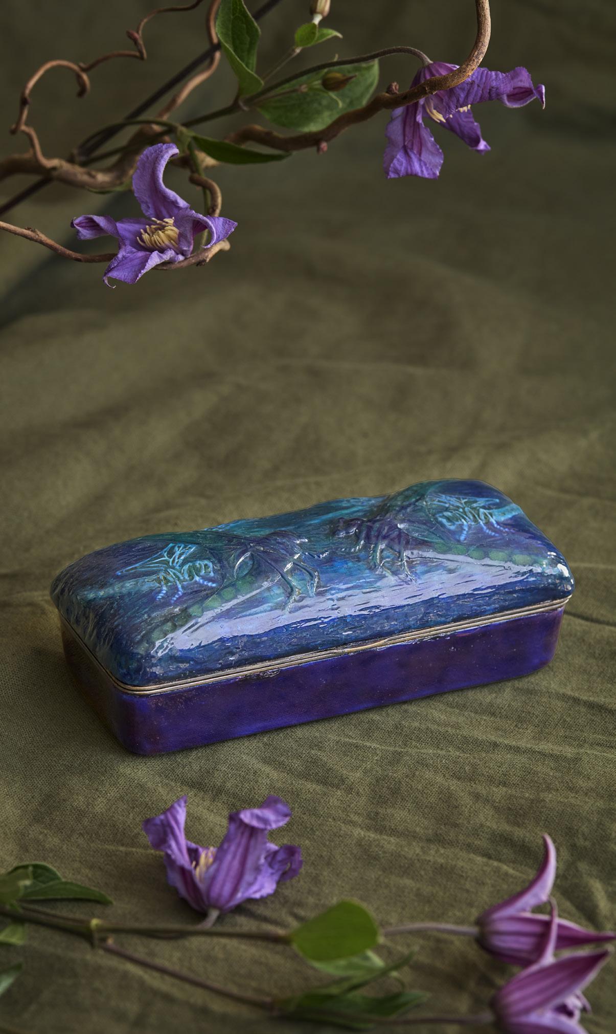 As an innovator, Lalique had previously employed enameling in his jewelery utilizing its properties to realize his creative visions in a way that others before him had not done. However, his boxes now featured much larger surface areas of enameling—it was used almost like paint. Compositionally, depth was created through overlapping forms, but then surface relief achieved by the layering of enamel in a rich palette of turquoise, green, blue, and purple on to the base metal of the box. The arrangement of the dragonflies headto-head is not quite symmetrical in keeping with the near-mirroring of forms featured in his earlier jewelry of dragonflies, grasshoppers, and scarab beetles.