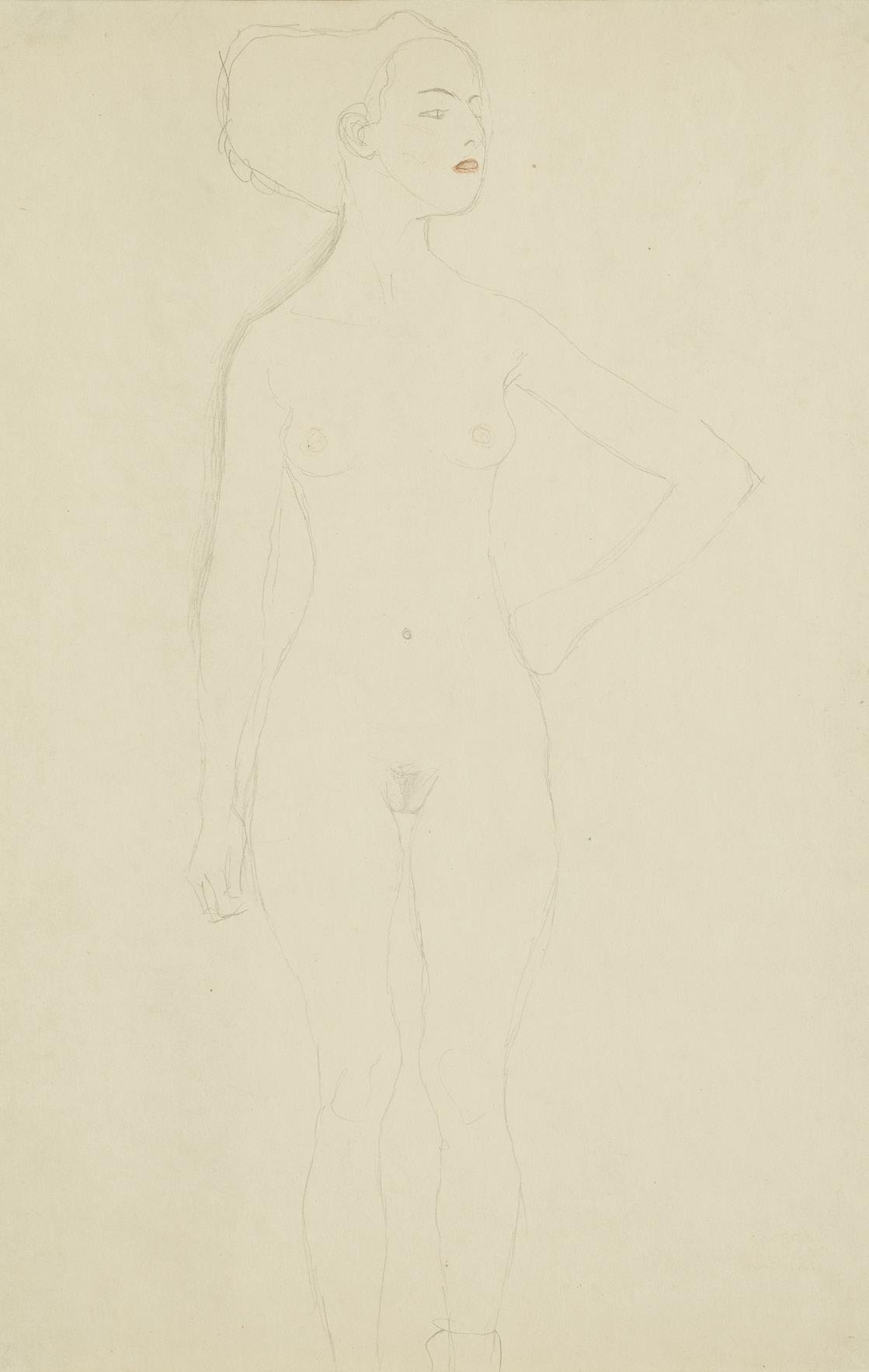 As with his great contemporary, Egon Schiele, Klimt presents the naked rather than the nude, the Academic life class taken out of halls of perfection into the backstreets and garrets where life teems. This sense of being naked rather than nude is accentuated through the red lipstick, a symbol of the worldly, the real. This is no eternal goddess but a real woman. In Standing Girl, the face is beautifully drawn, with an emotional precision, the hair rendered almost as an abstract shape to keep our attention on the eyes and the arch of the eyebrows, the curve of the nose, the set of the chin.