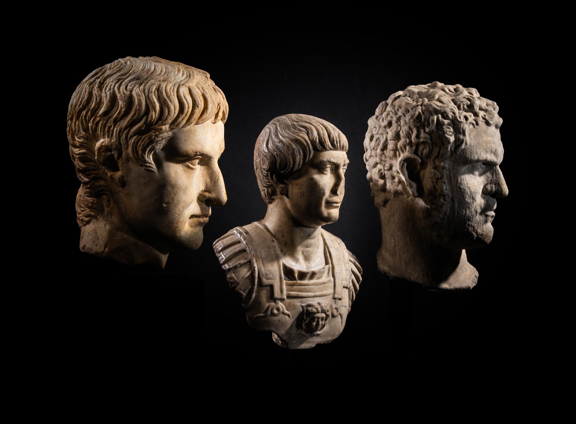 Marble portrait heads, including likenesses of Augustus (Circa 1st Century A.D., Estimate: $40,000 – 60,000), Trajan (Circa 98-117 A.D.
