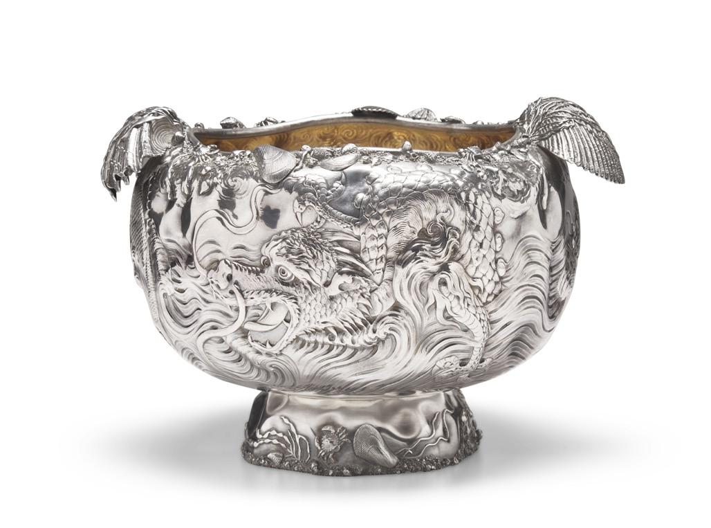 A Rare and Monumental Sterling Silver Japonesque Punch Bowl Gorham Mfg. Co., Providence, Rhode Island, Date Mark for 1885