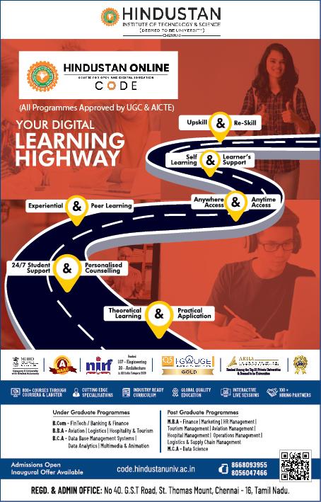 10 August 2021 is a significant day in the history of Hindustan Institute of Technology & Science. The day marks the Inauguration of Centre for Open and Digital Education (CODE) and the Unveiling of “Symphony at the Jubilee”, the mural at the Jubilee Block. CODE is an inclusive online learning platform of Hindustan launched to spread the light of knowledge to seekers who cannot physically join an Institution for higher studies. It aims to empower, enrich, enhance career prospects and enable inclusive education accessible anywhere. Thiru. Dr. K. Ponmudi, Hon’ble Minister of Higher Education, Govt. of Tamil Nadu presided over the event as the Chief Guest and unveiled the CODE plaque. Prof. M. P. Poonia, Vice Chairman, AICTE graced the occasion as the Guest of Honour. Col. Dr. G. Thiruvasagam, President, Association of Indian Universities, New Delhi; and Thiru. S. S. Balaji, MLA Thiruporur offered felicitations.