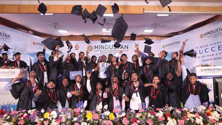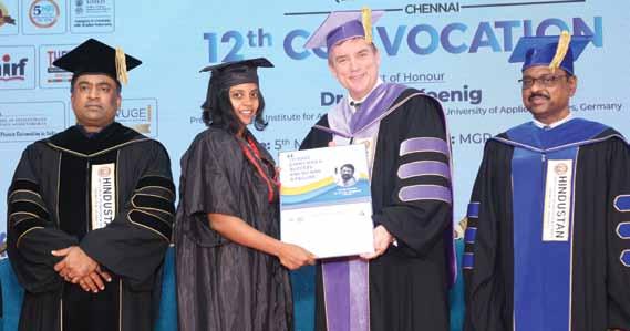 to India; and Mr. Priyadarshan, Indian Filmmaker graced the occasion as the Guests of Honour. Similarly, in the afternoon session of Day – 1, Dr. Peter Koenig Professor & Head, Institute for Automotive Technology, Trier University of Applied Sciences, Germany presided over as the Guest of Honour. During the Day – 2 of the Convocation, Dr. Saravanan, President & Chief Technology Officer, Ashok Leyland Ltd., and Dr. Kamal Kishore Sharma, Fellow of IIM – A, Director General, Taxila Business School, Jaipur presided as the Guests of Honour in the forenoon and afternoon sessions respectively. Dr. Elizabeth Verghese, Chancellor, HITS and Chairperson, Hindustan Group of Institutions; Dr. Anand Jacob Verghese, CEO, Hindustan Group of Institutions; Dr. S. N. Sridhara, Vice Chancellor; Dr. R.W. Alexander Jesudasan, Pro Vice Chancellor; Dr. Aby Sam, Director; Mr. Ashok Verghese, Director; Dr. Pon Ramalingam, Registrar; and Members of the Board of Management, Deans & HoDs, and Faculty Members presided over the grand event. During the Convocation, a total of 2093 graduands comprising UG, PG, Ph.D., and Diploma were awarded degrees. 70 Rank Holders were honoured with Prizes for their meritorious performance in academics. Doctor of Science (Honoris Causa) was conferred upon Mr. Kris Gopalakrishnan; and Doctor of Letters (Honoris Causa) was conferred upon H.E. Dr. Grace Akello and Mr. Priyadarshan. The Convocation was live-streamed in Hindustan’s YouTube Channel.