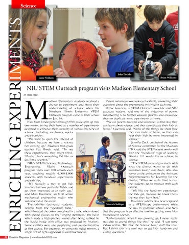 adison Elementary students received a chance to experiment and boost their understanding of science when the Northern Illinois University STEM Outreach program came to their school on Jan. 16. Kids from kindergarten through fifth grade split up into two rooms, trying their hand at a number of experiments designed to enhance their curiosity of various branches of science, including mechanics, optics and electricity. “We want to spark the interest of children, because we have a science fair coming up,” Madison first-grade teacher Pat Brody said. “To see these experiments, they might think, ‘Maybe that’s something I’d like to do. I’m a scientist.’” NIU’s STEM (Science, Technology, Engineering, Math) Outreach program visits over 100 schools each year, touching roughly 4,000-5,000 students with hands-on experiments and exhibits. “It’s basically a way to get kids involved in those particular fields, and get them interested at an early age,” said Matt Kucmierz, an NIU senior mechanical engineering major who volunteered at the event. The exhibits fascinated students, ranging from the “spectrum tube,” which isolated the colors contained in a tube when viewed with special glasses, to the “singing stemware,” the lid of which made a high-pitched sound after being rubbed by the liquid inside (this effect was produced by friction). Some exhibits were also perplexing and counter-intuitive at first glance. For example, by using two-sided mirrors, a single row of lights appeared to continue forever.
