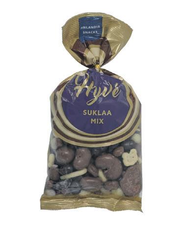Jogurttisuklaalla päällystettyjä manteleita, ananasta, banaanlastuja ja hasselpähkinöitä