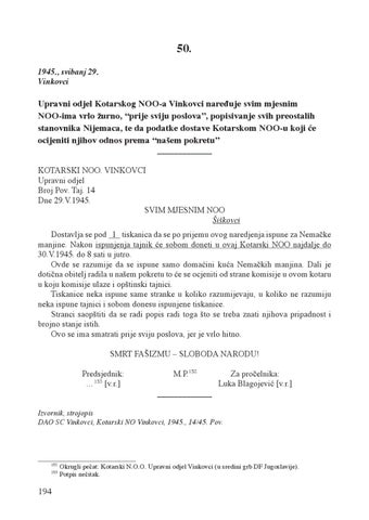 KOTARSKI NOO. VINKOVCI Upravni odjel Broj Pov. Taj. 14 Dne 29.V.1945. SVIM MJESNIM NOO Šiškovci Dostavlja se pod 1 tiskanica da se po prijemu ovog naredjenja ispune za Nemačke manjine. Nakon ispunjenja tajnik će sobom doneti u ovaj Kotarski NOO najdalje do 30.V.1945. do 8 sati u jutro. Ovde se razumije da se ispune samo domaćini kuća Nemačkih manjina. Dali je dotična obitelj radila u našem pokretu to će se ocjeniti od strane komisije u ovom kotaru u koju komisije ulaze i opštinski tajnici. Tiskanice neka ispune same stranke u koliko razumijevaju, u koliko ne razumiju neka ispune tajnici i sobom donesu ispunjene tiskanice. Stranci saopštiti da se radi popis radi toga što se treba znati njihova pripadnost i brojno stanje istih. Ovo se ima smatrati prije sviju poslova, jer je vrlo hitno. SMRT FAŠIZMU – SLOBODA NARODU!