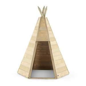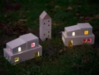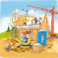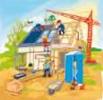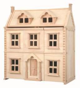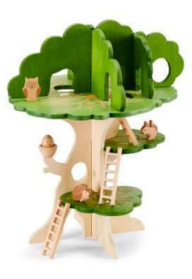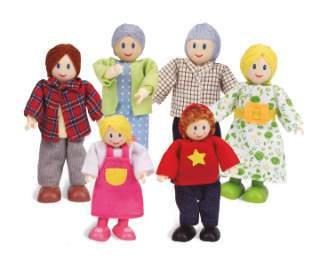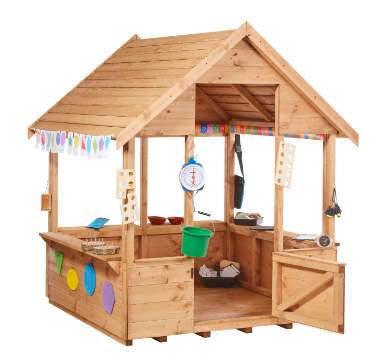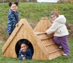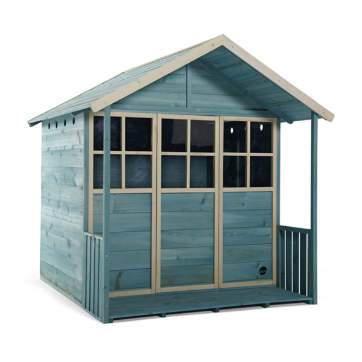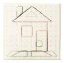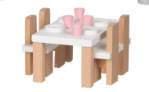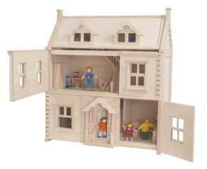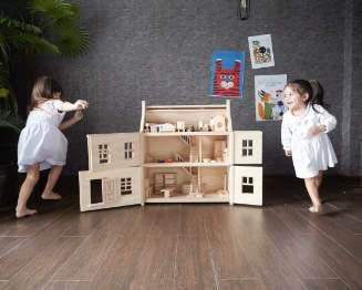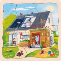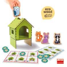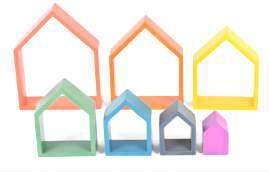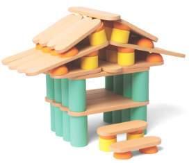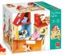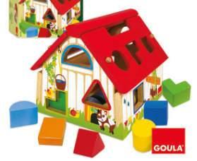 Caseta de fusta amb 2 peces desmuntables a la teulada i 6 figures de fusta de formes geomètriques