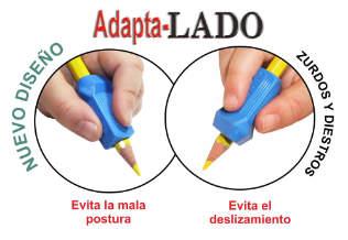 Adaptador per a la correcció en l'escriptura. Especial disseny que permet dues postures possibles per corregir els errors més comuns a l'hora d'agafar el llapis. Punt de suport per als que avancen els dits, amb tres cares per a tres dits.