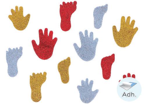 Bossa 30 unitats de mans i peus amb purpurina adhesives en 3 colors i dues mides de 36 mm i 45 mm.