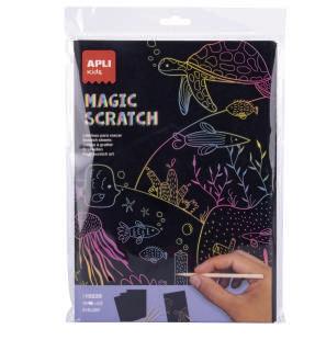 Pack de làmines per rascar "Magic Scratch" en mida A4 (210 x 297 mm). Cada pack conté 10 fulles i 5 palets de fusta com a eina per rascar. Quan es grata, es descobreixen els diferents colors del fons, creant bonics dibuixos amb els colors de l'arc de Sant Martí. Ideals perquè els nens facin volar la seva imaginació amb les creacions. Format còmode i pràctic per utilitzar tant a la llar com a escoles i tallers infantils.