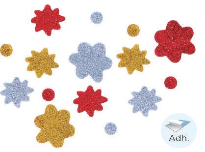 Bossa 60 unitats de flors amb purpurina adhesives en tres colors i dues mides 24 mm i 32 mm.