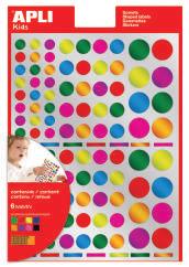 Bossa de gomets rodons amb adhesiu permanent en diferents colors amb acabat metal·litzat: verd, taronja, rosa, blau, vermell, lila i groc. Tres tamanys assortits: Ø 10 mm, Ø 14 mm i Ø 20 mm. Cada bossa conté 6 fulls amb gomets assortits, un total de 624 gomets per bossa.