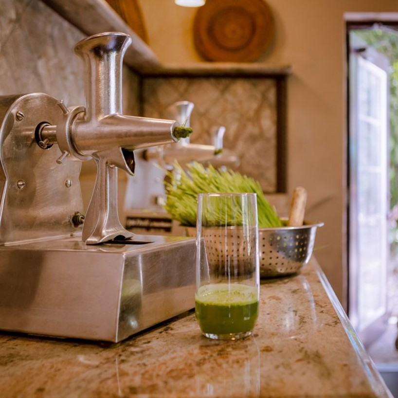 You can trust that all our wheatgrass is organically and lovingly grown on campus in our greenhouses. Visit our juice bar, where guests can enjoy full access to the highest quality equipment and nutrient-dense wheatgrass and connect to the process by juicing their own alkalizing green elixir any time.