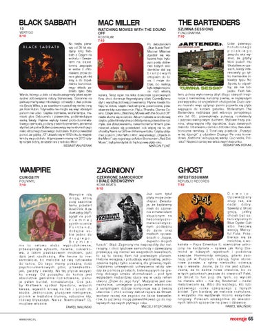 VERTIGO 8/10 No nieźle, pierwszy od 35 lat studyjny long Sabbath z Ozzym na wokalu i Geezerem na basie. Iommi, zwycięski w walce z chłoniakiem, znów obraca gitarą jak nikt inny, a do dopełnienia kanonicznego składu zabrakło tylko Billa Warda, którego z dala od studia zatrzymały jakieś ezoteryczne zobowiązania natury biznesowej. Gościnnie na perkusji mamy więc młodszego od reszty o dwa pokolenia Brada Wilka, a za suwakami rozsiadł się nie kto inny jak Rick Rubin. Trzynastka nie mogła się więc starszym panom nie udać. Ciężkie brzmienie, wolne tempa, maniacki głos Osbourne’a i przewrotne, podśmierdujące siarką teksty. Pięknie wykuty kawał proto-doommetalowego rzemiosła, podany z takim brzmieniem, że niemal słychać jak palce Butlera przesuwają się na strunach jego nisko strojonego basowego buldożera. Rubin powiedział ponoć, że gdyby „13” ukazało się w 1972 roku, to wszystkim by się podobało. A tymczasem mamy rok 2013 i płytę na tyle dobrą, że szatan sra z radości. Moc! SEBASTIAN RERAK