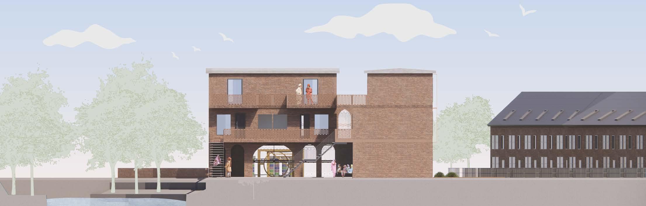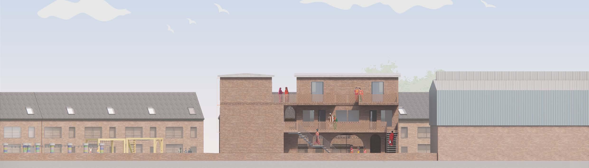 Material First approach is used to reduce impact on the 100 Million tonnes of building waste created. Prioritising the reuse of materials such as reclaimed brick and steel from the site, thus increasing their lifespan. Spatial design in terms of Building Regulations and the London Housing guide.