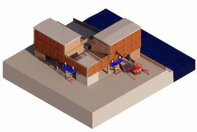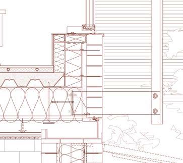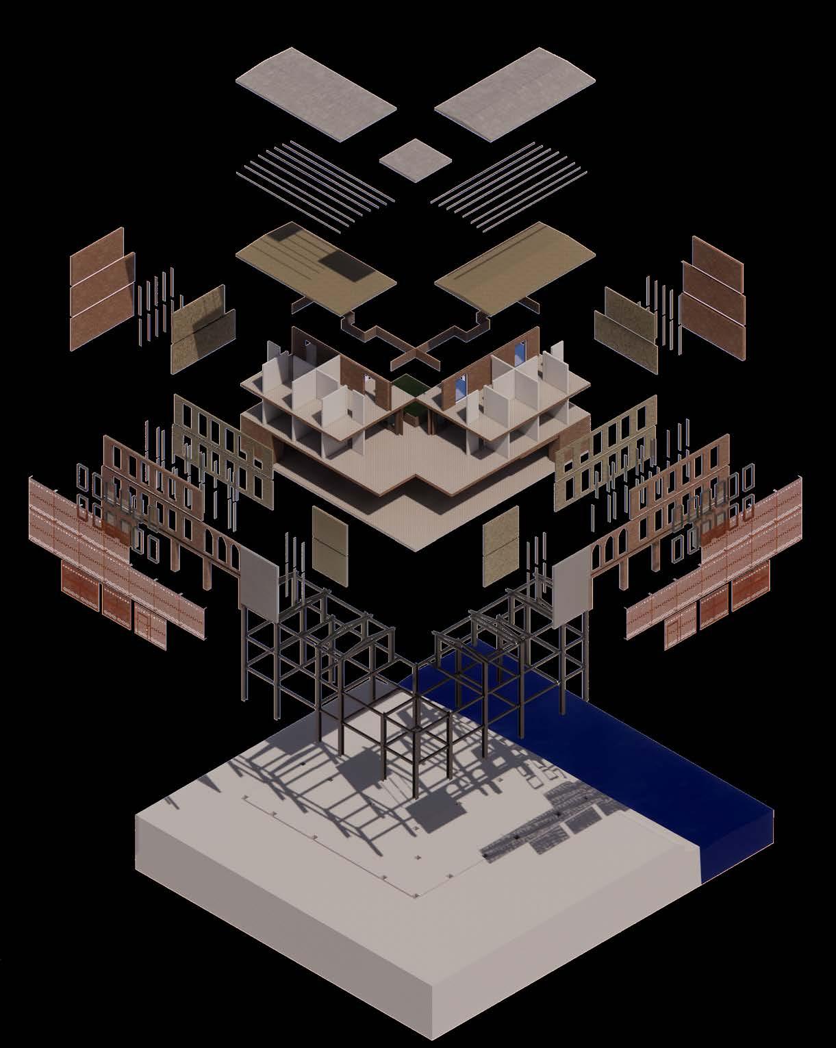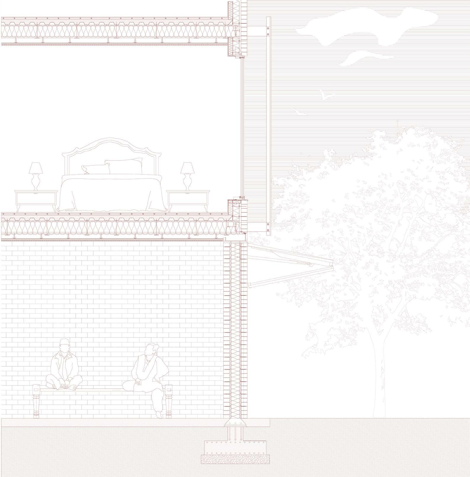 After adding all the other layers of the envelope system, such as membranes and another layer of simulation, the final facade finishes are added. Reclaimed brick from the site for the main facade and pre fabricated concrete panels for the roof and circulation block.