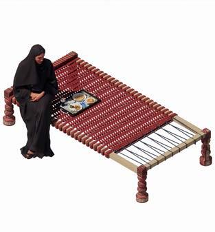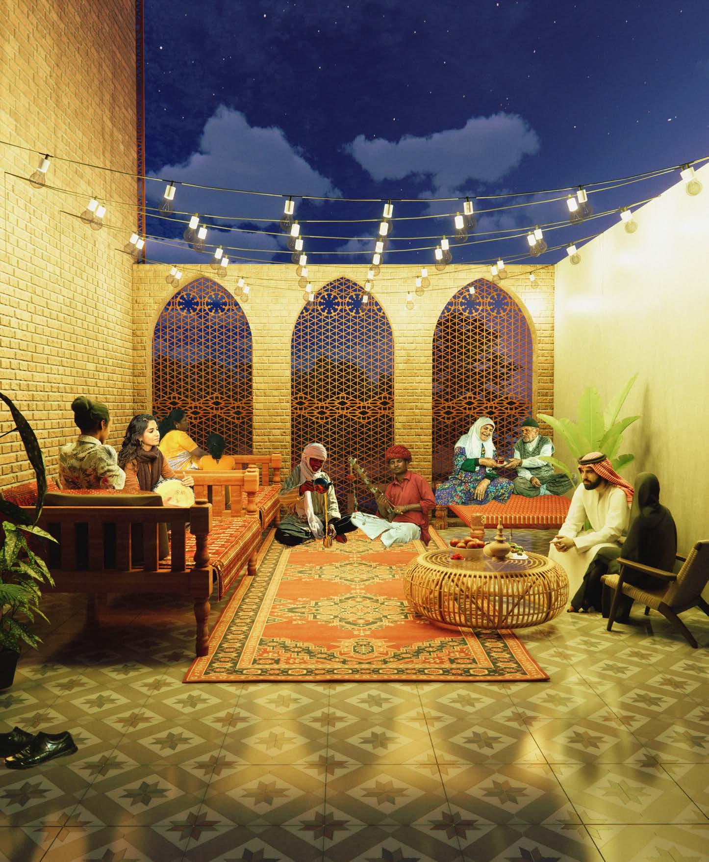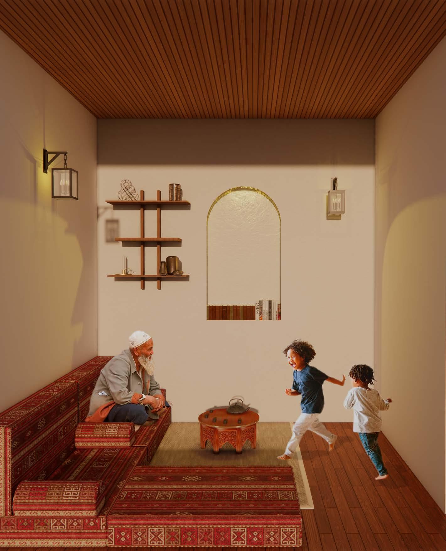 This space represents Persian and African culture, drawing inspiration from their architectural traditions and spatial practices. Floor sofas encourages intimate social interactions by removing physical barriers and promoting a relaxed atmosphere conducive to conversation, bonding, and shared experiences, fostering a sense of connection and community among inhabitants.