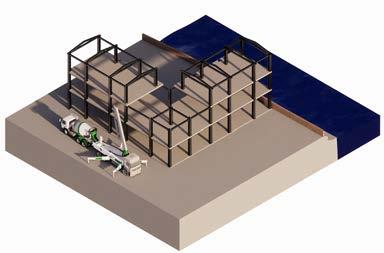 After laying down the corrugated steel decking, concrete/screed is poured to create level floor slab, which will allow workers to continue the construction process.