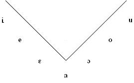 Lis vocâls si puedin disponi come intun triangul là che a man çampe a son chês che si produsin un pôc plui de bande devant de bocje, a man drete a son chês che si produsin plui indaûr: la vocâl [] e je la plui basse; a pene parsore a son [] e [], ven a stâi lis vocâls e e o viertis, e plui insù [] e [], sieradis, e dutis chestis cuatri a son lis vocâls mediis; lis vocâls [] e [] a son chês altis.