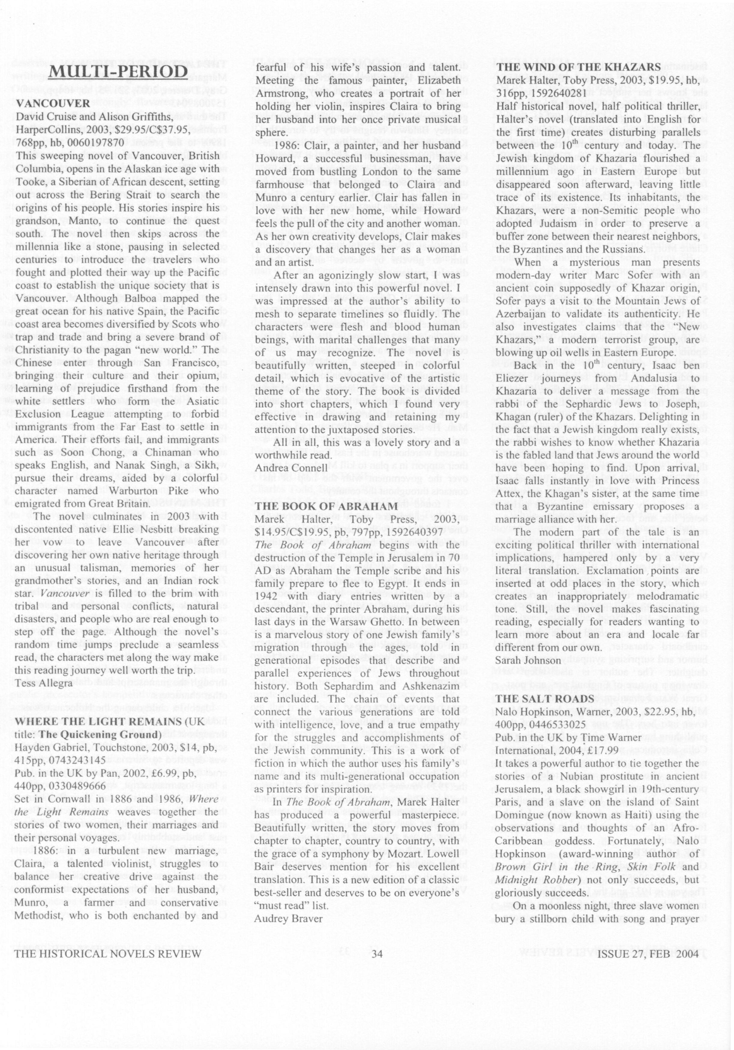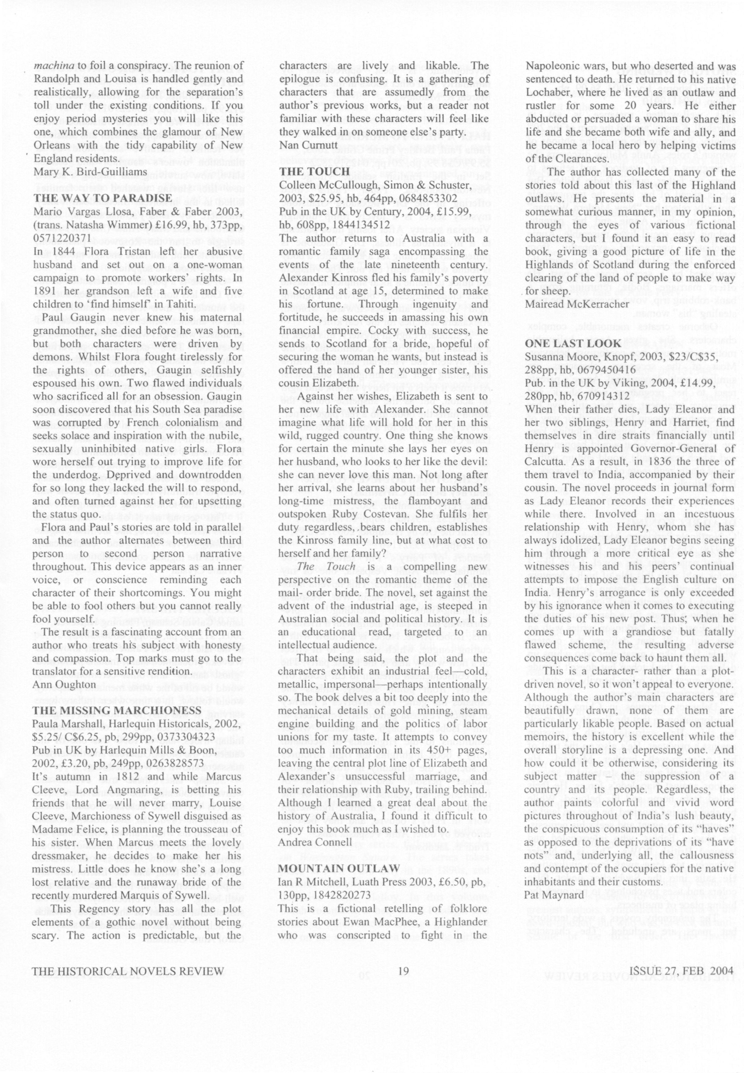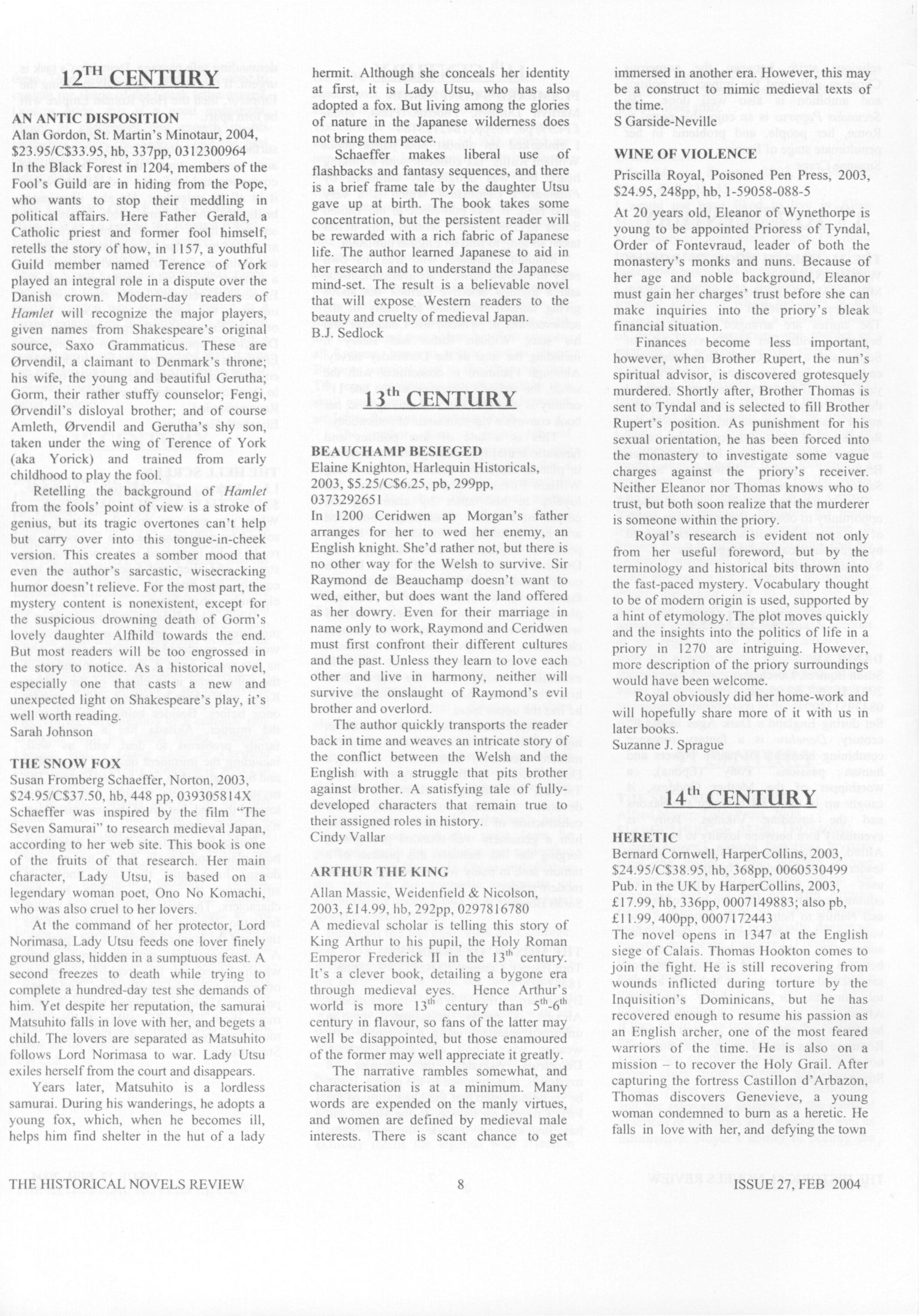 Regular readers will know that Sally Zigmond stepped down as UK Coordinating Editor of the Review at the end of 2003, although, happily, she is staying on as a reviews editor. So, a new year, a new editor, whose first task - even before begging your indulgence, dear reader, while I find my feet - must be to thank Sally for a wonderful job. When I joined the HNS just over a year ago, I immediately felt at home. I found the Review info1mative, entertaining, easy to read, but more than that , a gateway to a community with a shared passion for historical fiction. As a woman of a certain age who had recently emerged from a creative writing MA with a bevy of fiendishly clever twenty-something postmodern is ts, I can't tell you what a relief it was 1