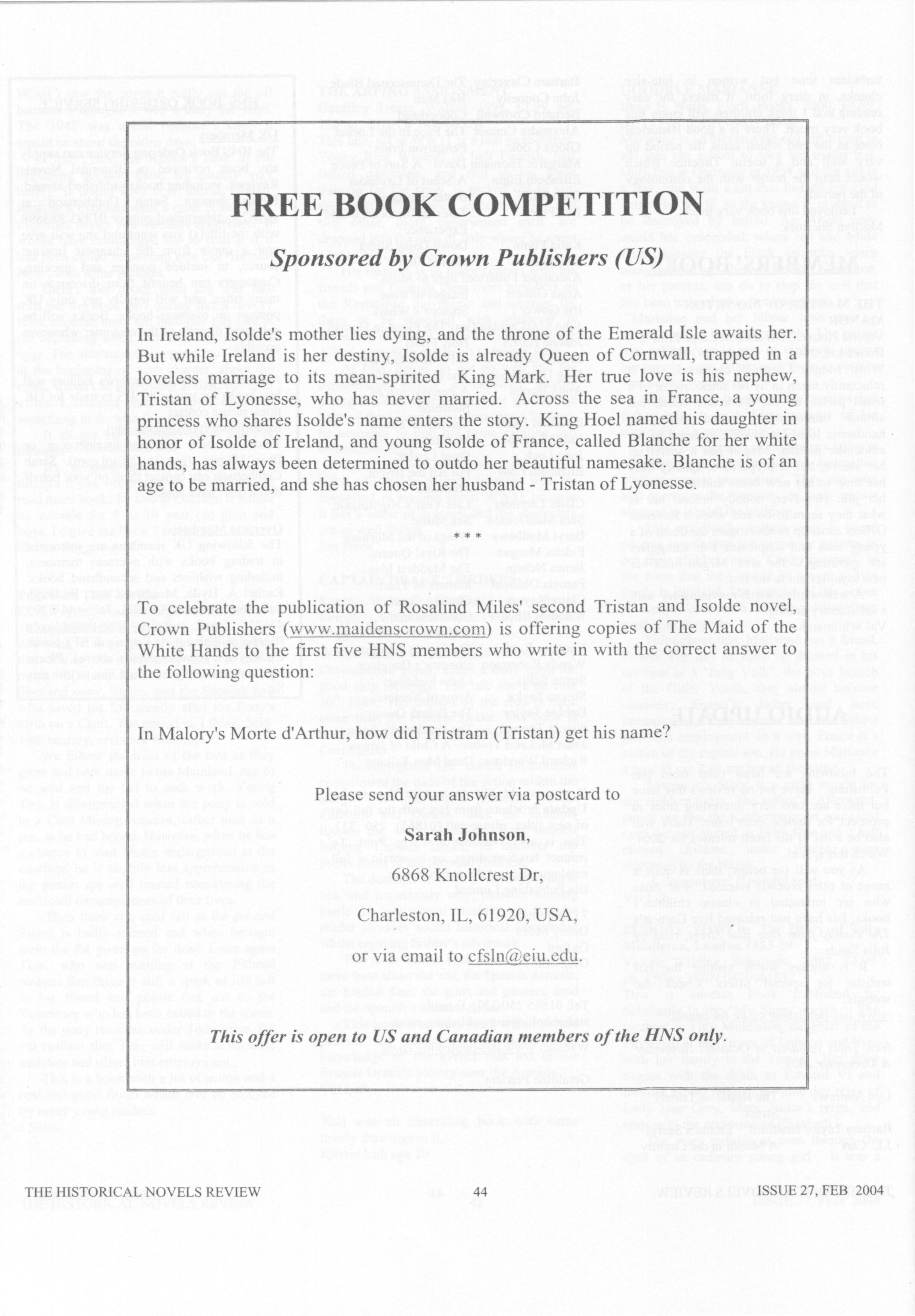 To celebrate the publication of Rosalind Miles' second Tristan and Isolde novel , Crown Publishers (v.rww.maidenscrown.com) is offering copies of The Maid of the White Hands to the first five HNS members who write in with the correct answer to the following question: