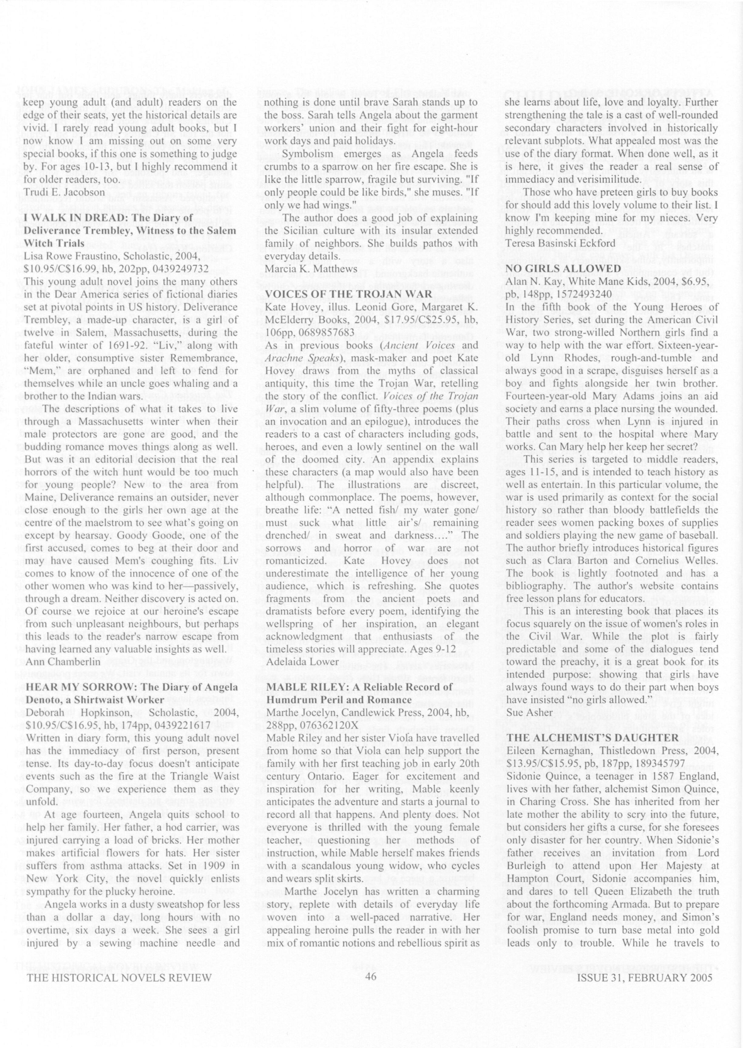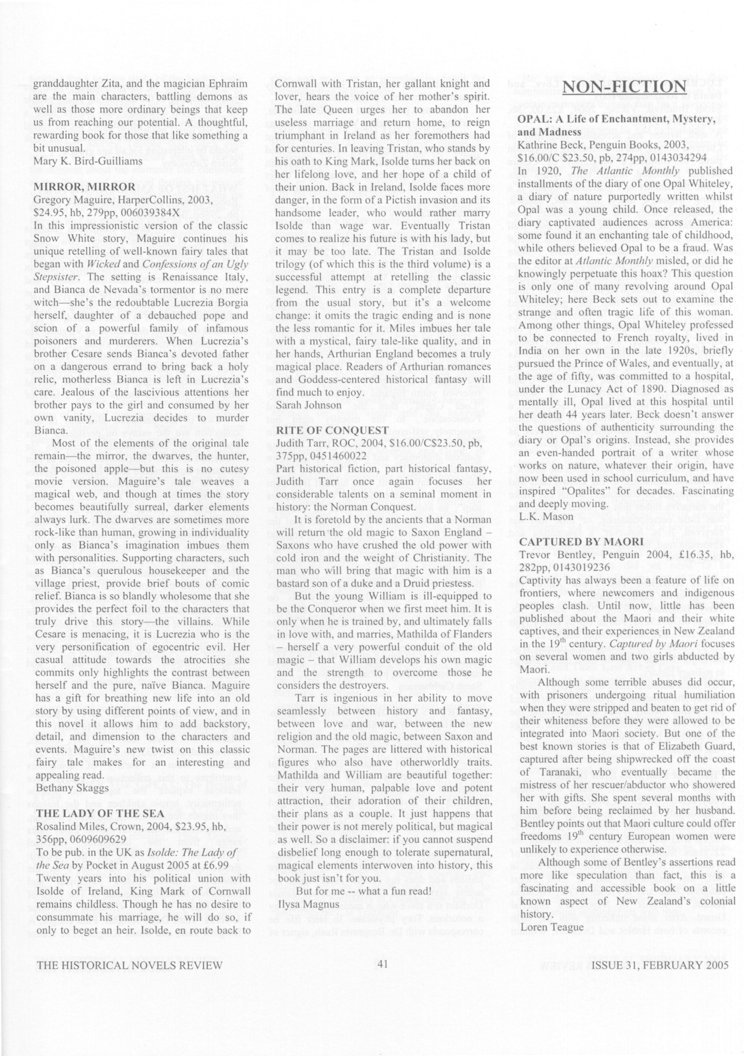 for independence from England and her implacable king, Edward I. Narrated by young Marjorie Bruce, the captured daughter of Scotland's new King Robert the Bruce, the story flashes back to events leading up to her horrendously inhumane imprisonment in an outdoors cage. Well researched, the cruelties and horrors perpetrated by the ambitious and power grasping selfish are clearly expressed. But even as Marjorie suffers exposure, pelting and starvation by her captors, her strength and resolve eventually evoke some mercy and goodness of the townspeople who defy Kin_g Edward and lesson her torture. Jane Yolen 1s renowned for her numerous collections of worldwide myths and talcs, as well as novels, for young adults and Robert Harris, too, has many no\'cls to his credit. Although aimed at the young reader, adults will easily enjoy this quick read and seeing the past through the eyes of a young princess largely overlooked by historians is very refreshing.