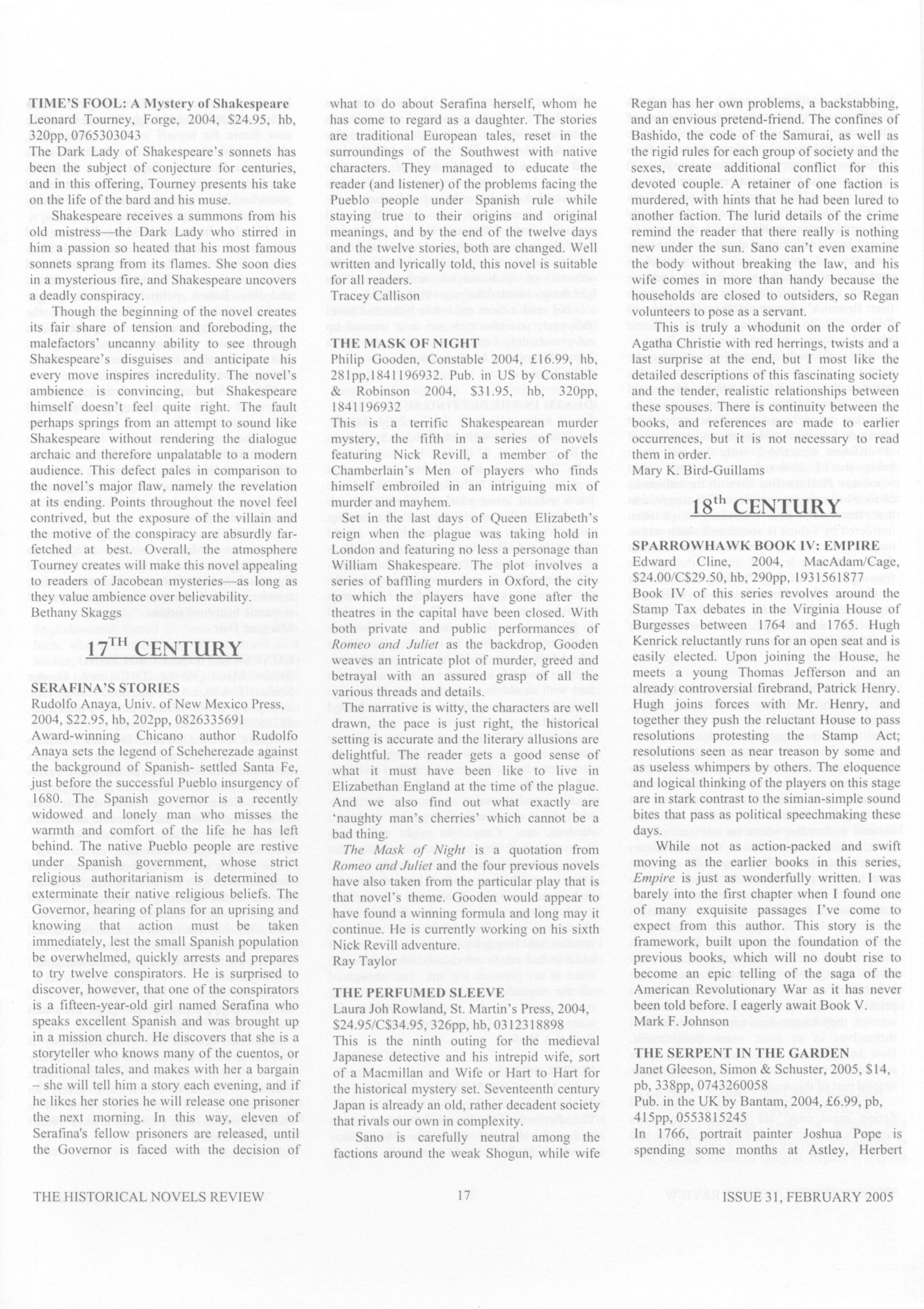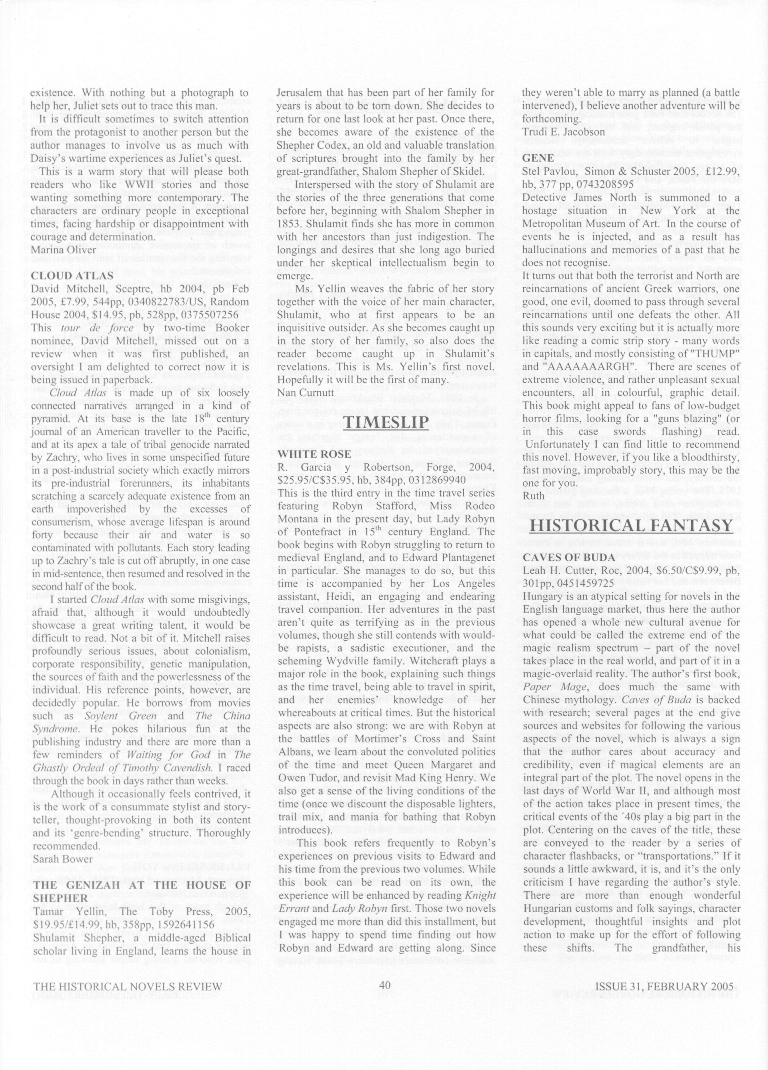 There are no reviews for this issue but the next update will feature reviews of Andrew Taylor's Call the Dying and Michael de Larrabeiti's Foxes' Oven.