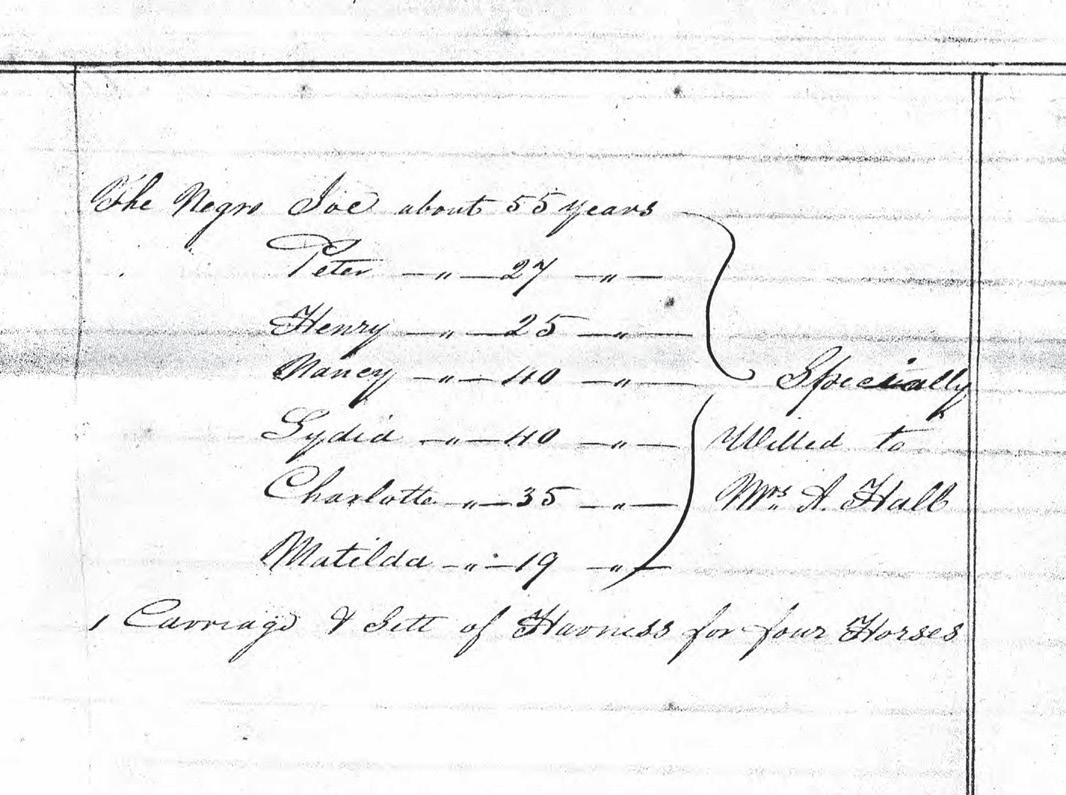 To inform the storytelling found at each audio stop, Historic Columbia Curator Rebecca Woodruff pulled inspiration from numerous primary sources. Records indicate that Ainsley Hall willed seven enslaved men and women—Charlotte, Henry, Joe, Lydia, Matilda, Nancy, and Peter—to his wife, Sarah. While their names survive, their thoughts, duties, and futures are lost to the historical record.