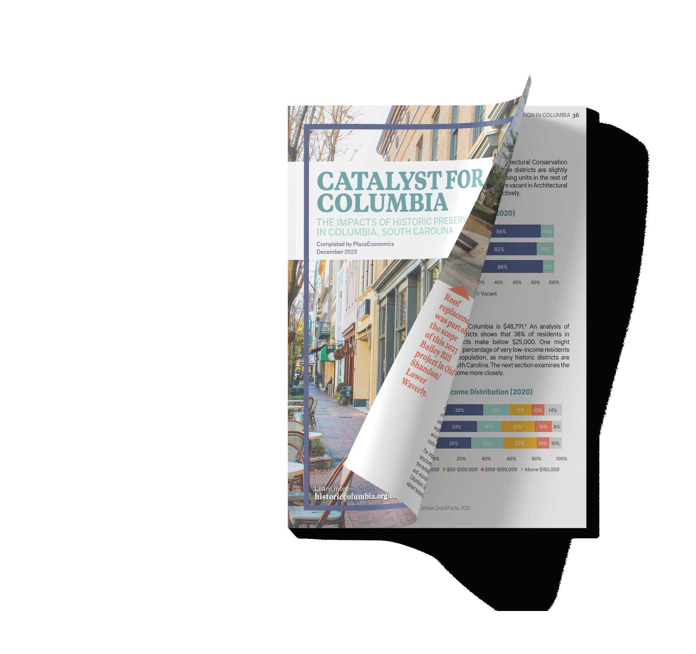 In 2023, Historic Columbia commissioned PlaceEconomics— a nationally recognized leader in real estate and historic preservation research—to conduct a study on the impact of historic preservation on Columbia's economic health. The first of its kind for the Midlands, the study's findings reinforce our long-held position on the importance of historic preservation for the city's economy and support our work advocating for policies that encourage preservation and the reuse of historic buildings. This study confirms that preserving Columbia’s architectural heritage is not simply an exercise in nostalgia, it is an informed, strategic investment in the future.