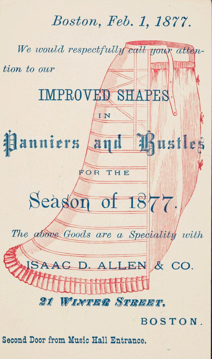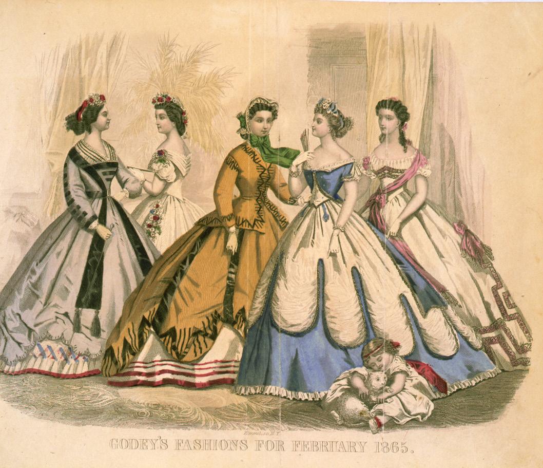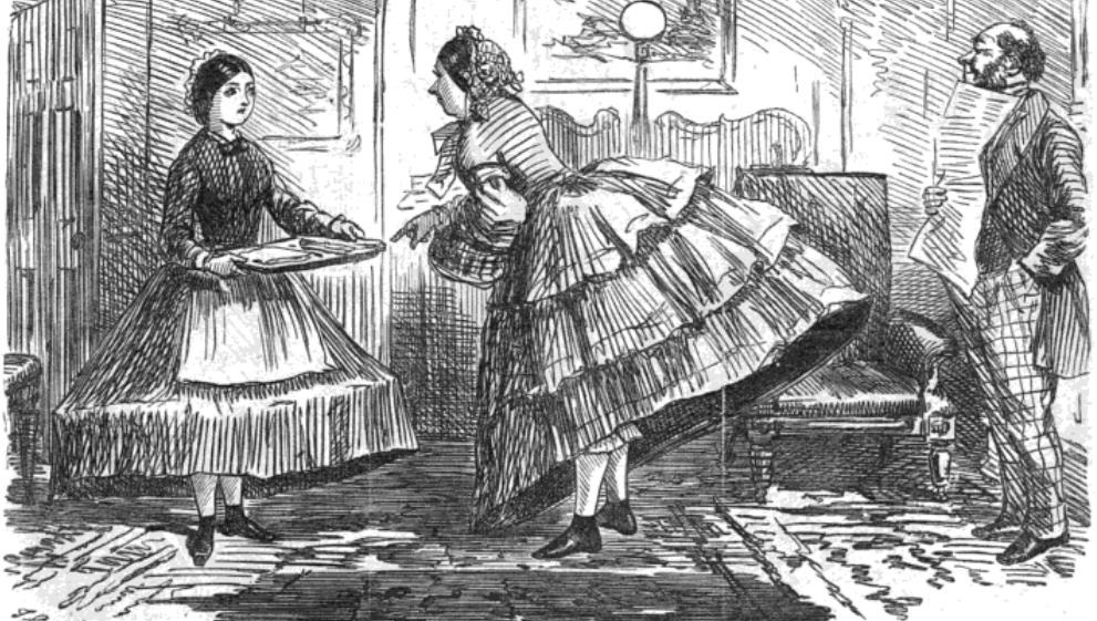 Godey’s Lady’s Book illustration of fashions for February 1865. Trade card for Isaac D. Allen & Co. in Boston, which specialized in gloves, corsets, panniers, and hoop skirts. An image published in an 1862 issue of Punch depicts a woman demeaning a domestic worker for wearing a crinoline: “Mary! Go and take that thing off directly! Pray, are you aware what a ridiculous object you are?”
