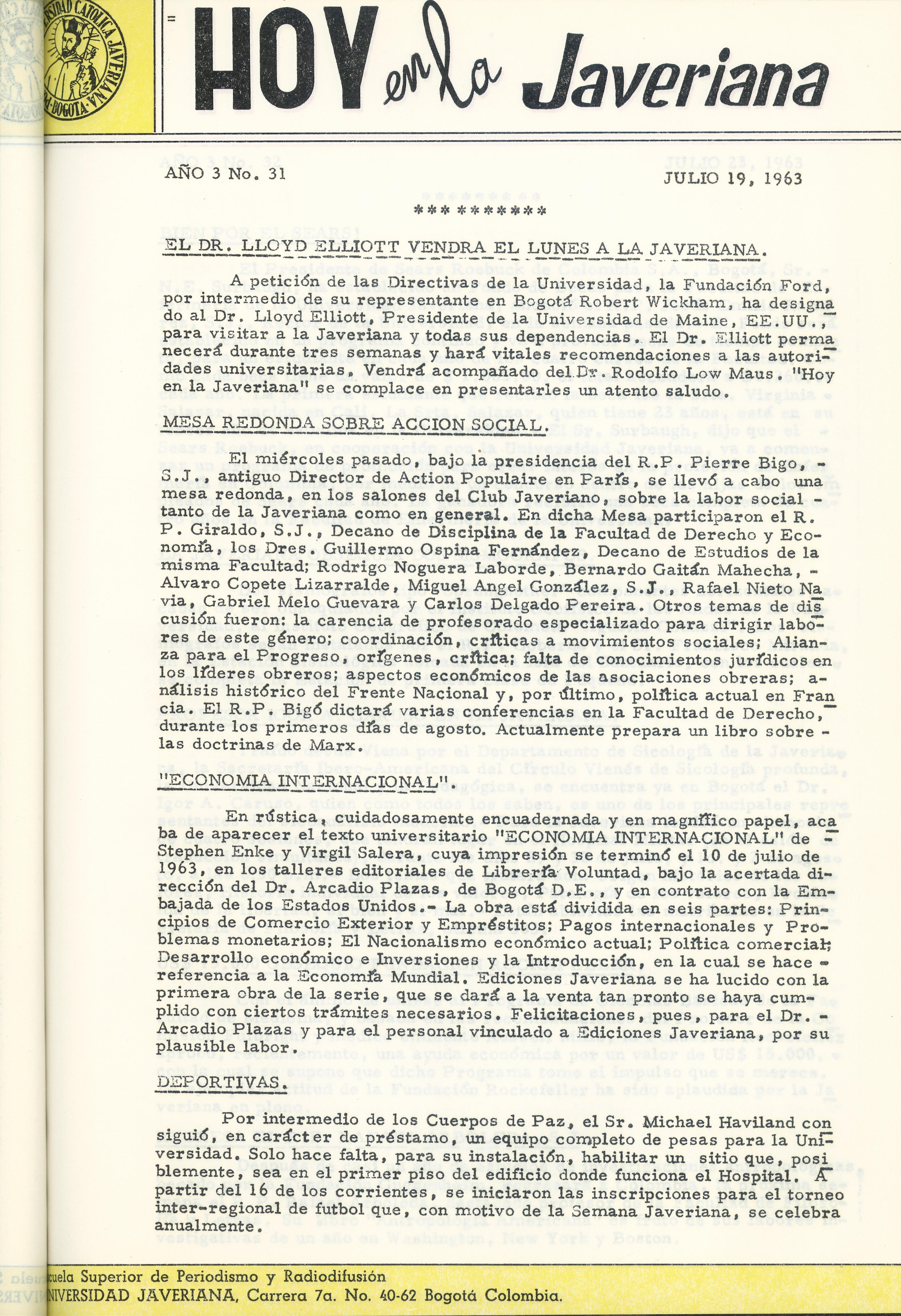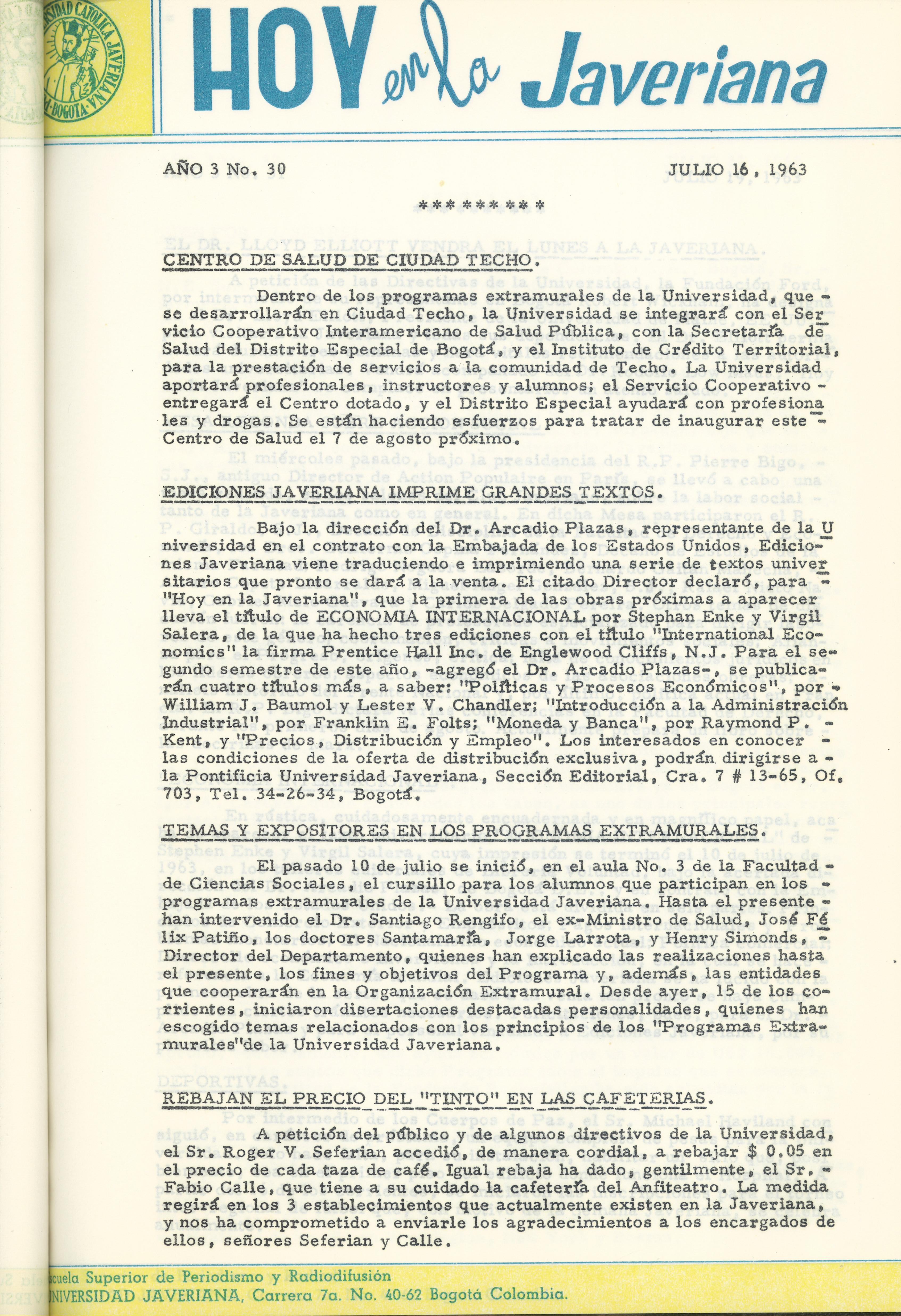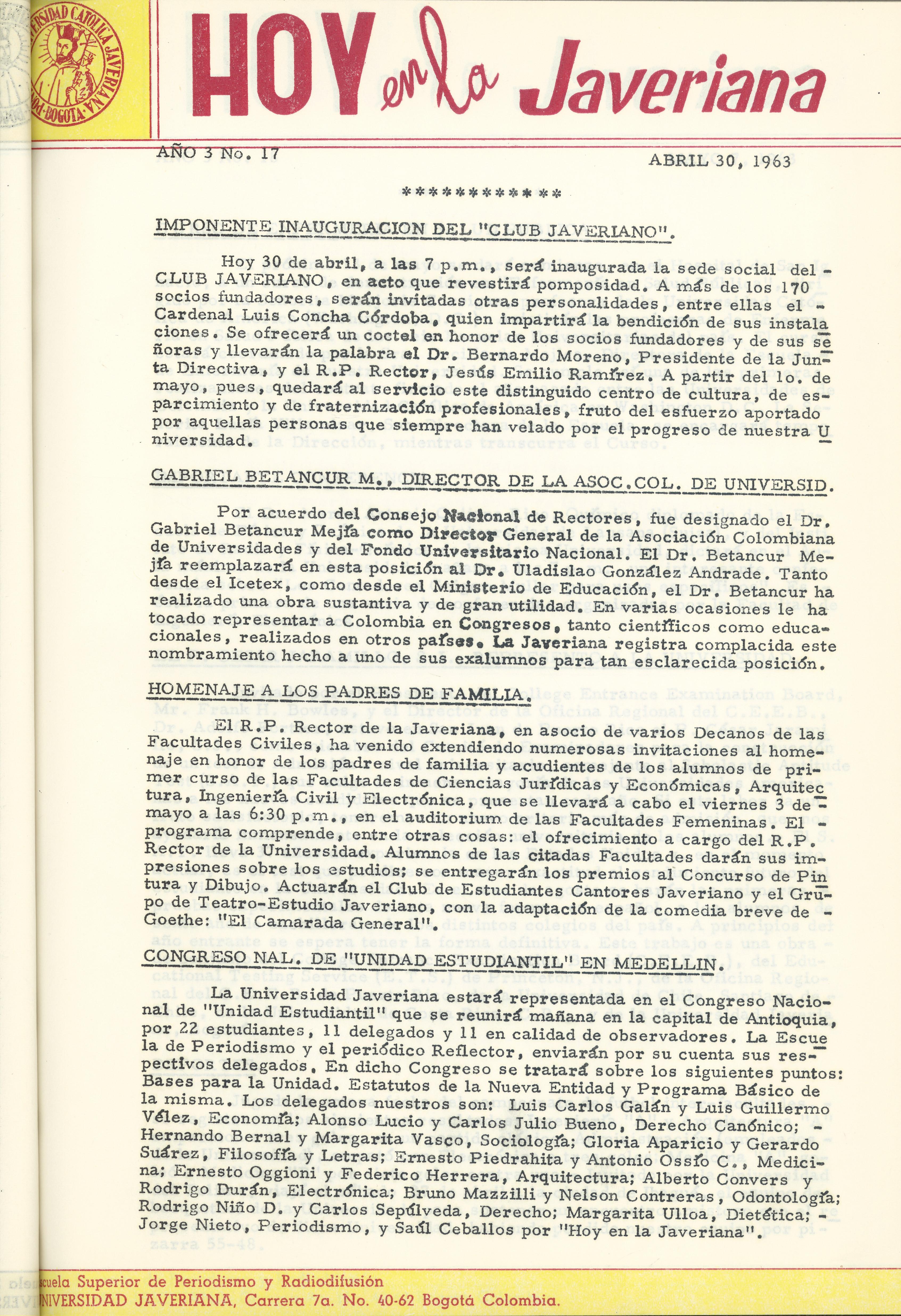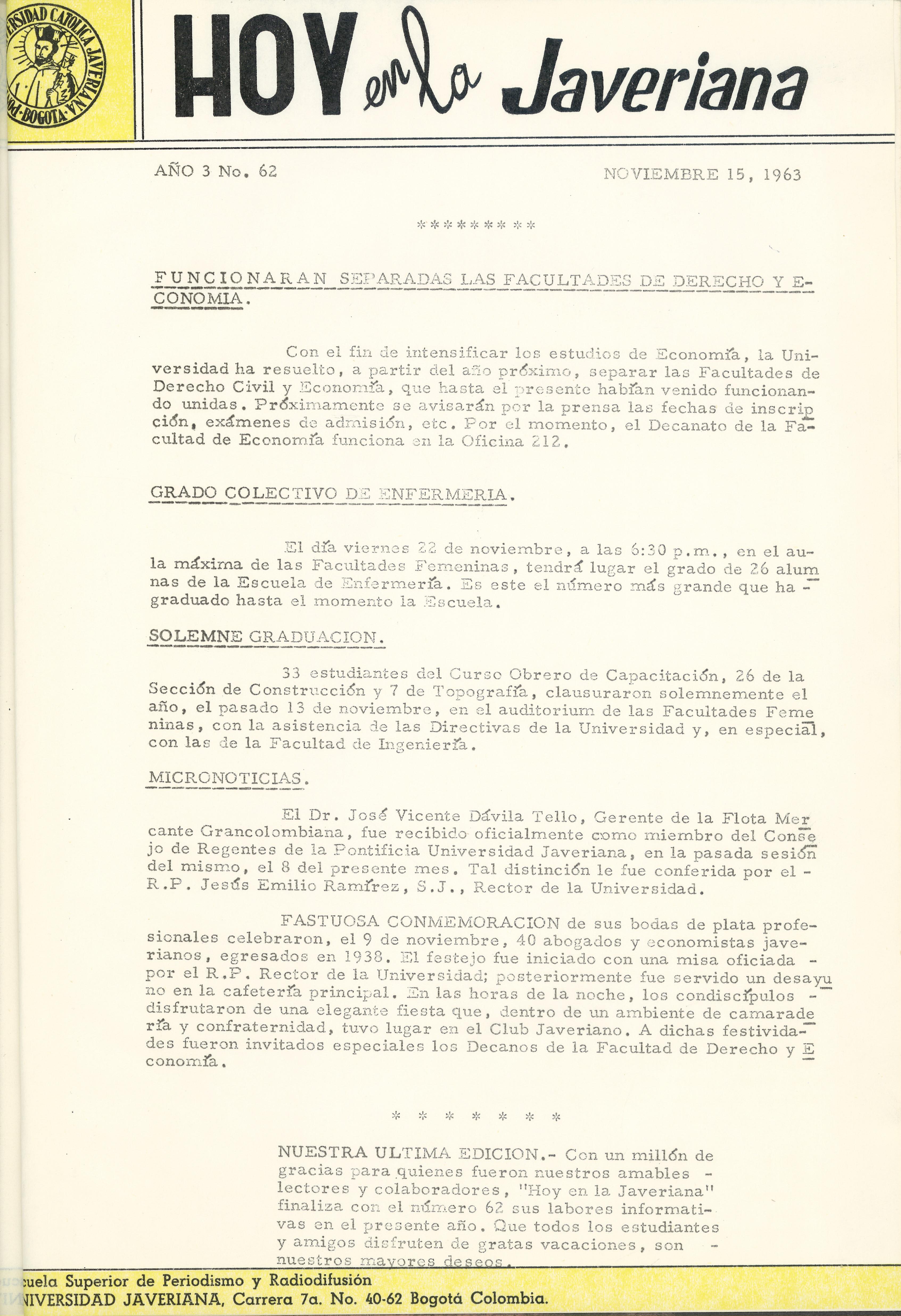 NUESTRA ulTrl\4A .EIDICION.- can un rnildn d.e gracias para .quienes fueron nuestros amables lecte¡res y colaboradores , ttHoy en ra Javeriana, finaliaa con el rufrz:,ero 62 sus labores inforrn&tivas en eI presente año. Que todos los estudiantes y anrigos dicfruten cl.e gratas vacaciones, son nuestros rr.ia