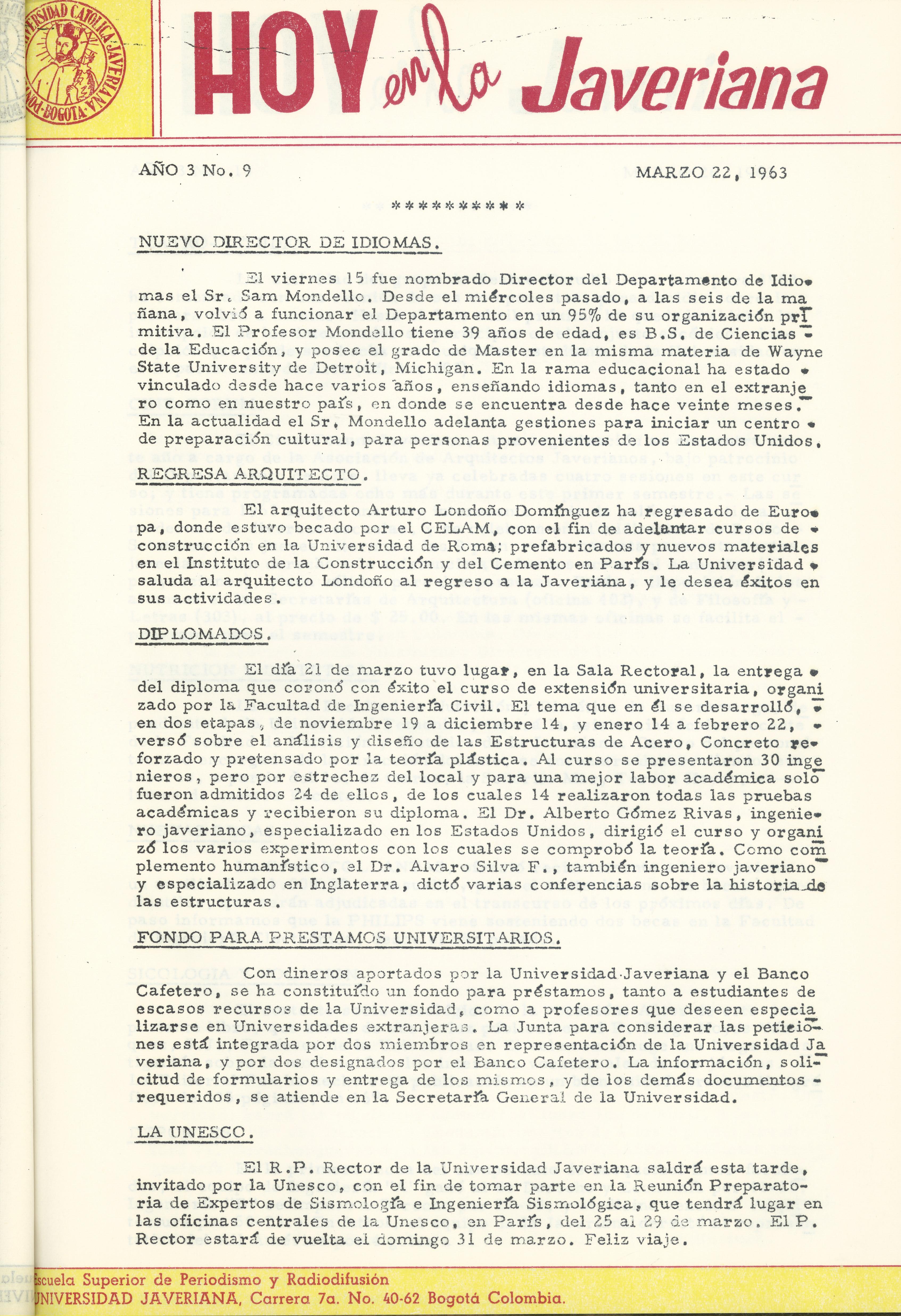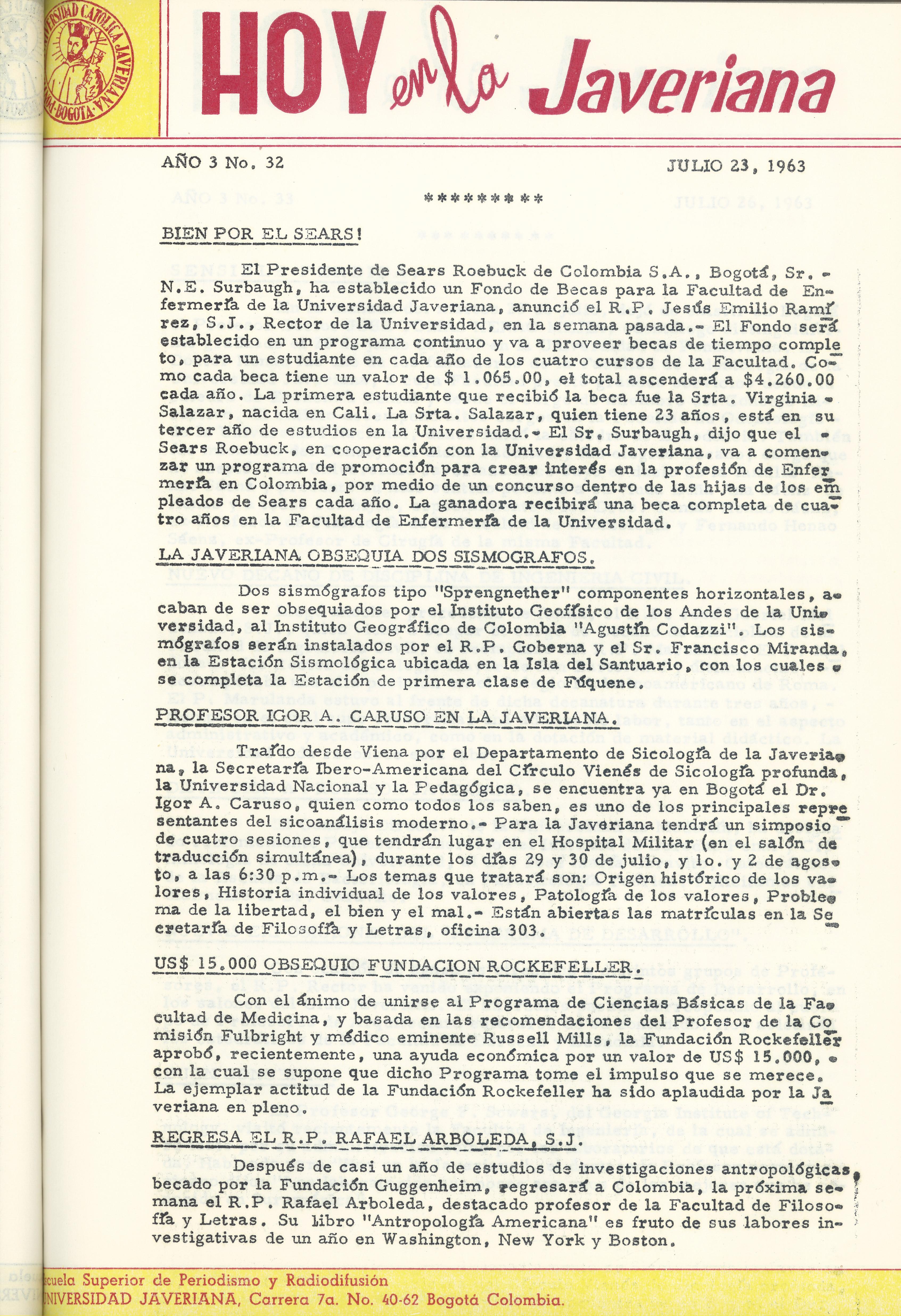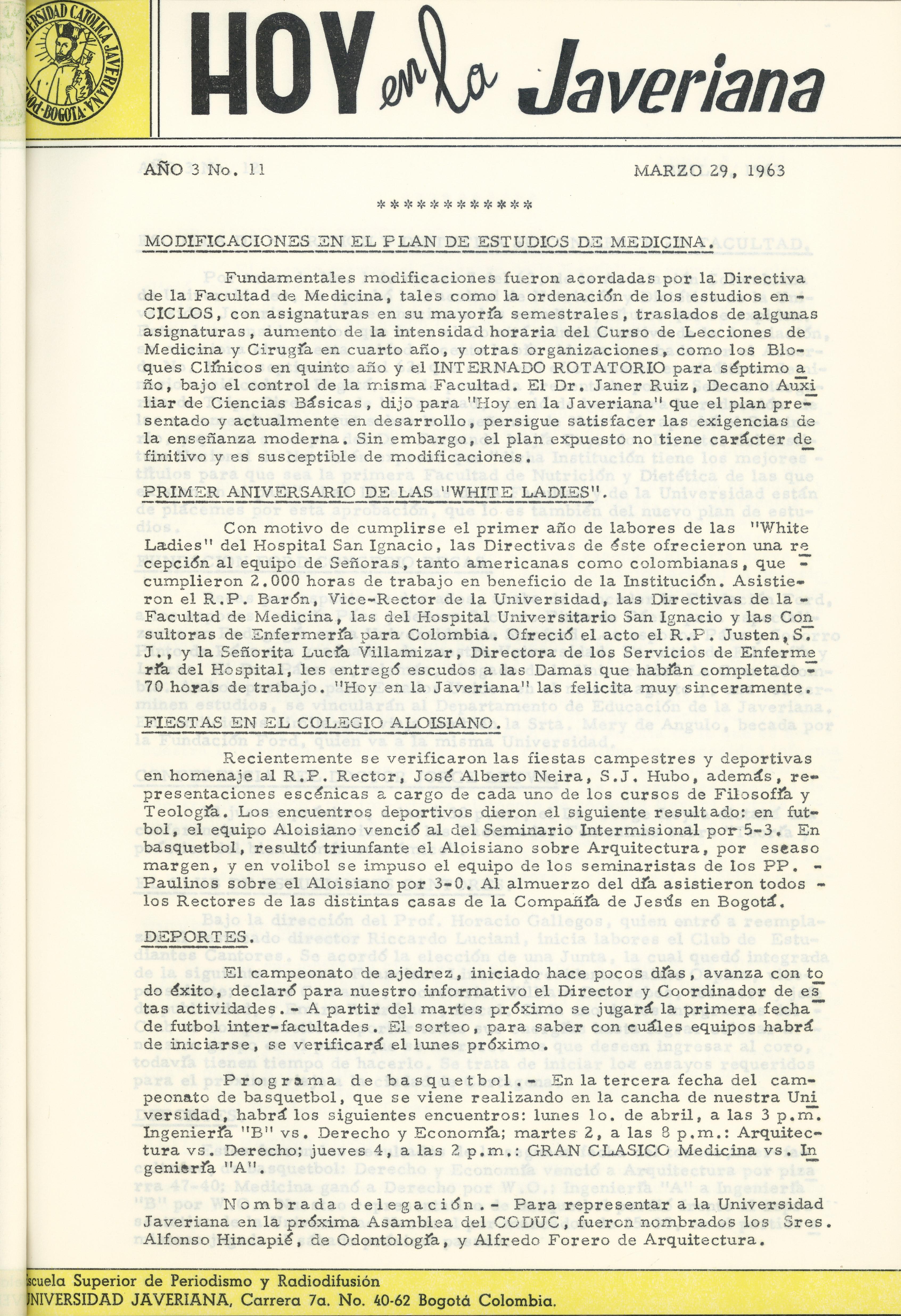 Asf 1o comunicd el Jefe del Servicio de CoorCinacidn y Vigilancia U niversitaria, Vicente Bejarano Manrique, al R.P. Rector de Ia Jáverianal Dice La nota en r:aención: ItTengo eI gusto de enviarle las siguientes providencias relacionadas con unidades docentes de esa Universidad: ACUERDC No. 4t-, - Fcr el cual el Comitá Administrativo <ie la Asociacidn Colornbiana Ce Universidacles le irnpartid su aprobacidn al nuevo plan de estudios de la Escuela §upericr de Periodismo y Radiodifusidn, el cual fue aprobado pcr el Ministerio de liducacidn Nacional, en virtud de la llesolucidn No. 3537de 7 Ce r:ctubre Ce 1963".- |IACUTIRDO No. 45 - For eI cual el misrno Con.ité aprcbdr Brr fornra definiti.va, Ias Escuelas de S,IRVICIO SOCIAL e INV"E;I'XIGACIIN §CCIAL, dependientes de la Facultad de Ciencias Sociales de esa Universidad. Este Acuerdo fue aprobado por el fuIinisterio de Educaci6n, segrfn liesolucidn 3535 Ce cctubre 7 del presente a'ñ.or'.- Adjunta a las cita.das prcvidencias, llegá a la R"ectorfa copia del inforrne de Ia visita de carlcter acaddrnico practicada pcr el Dr. Josd Manuel Rivas Sacconir €r1 el cual ce hacen algunas recoroendaciones.