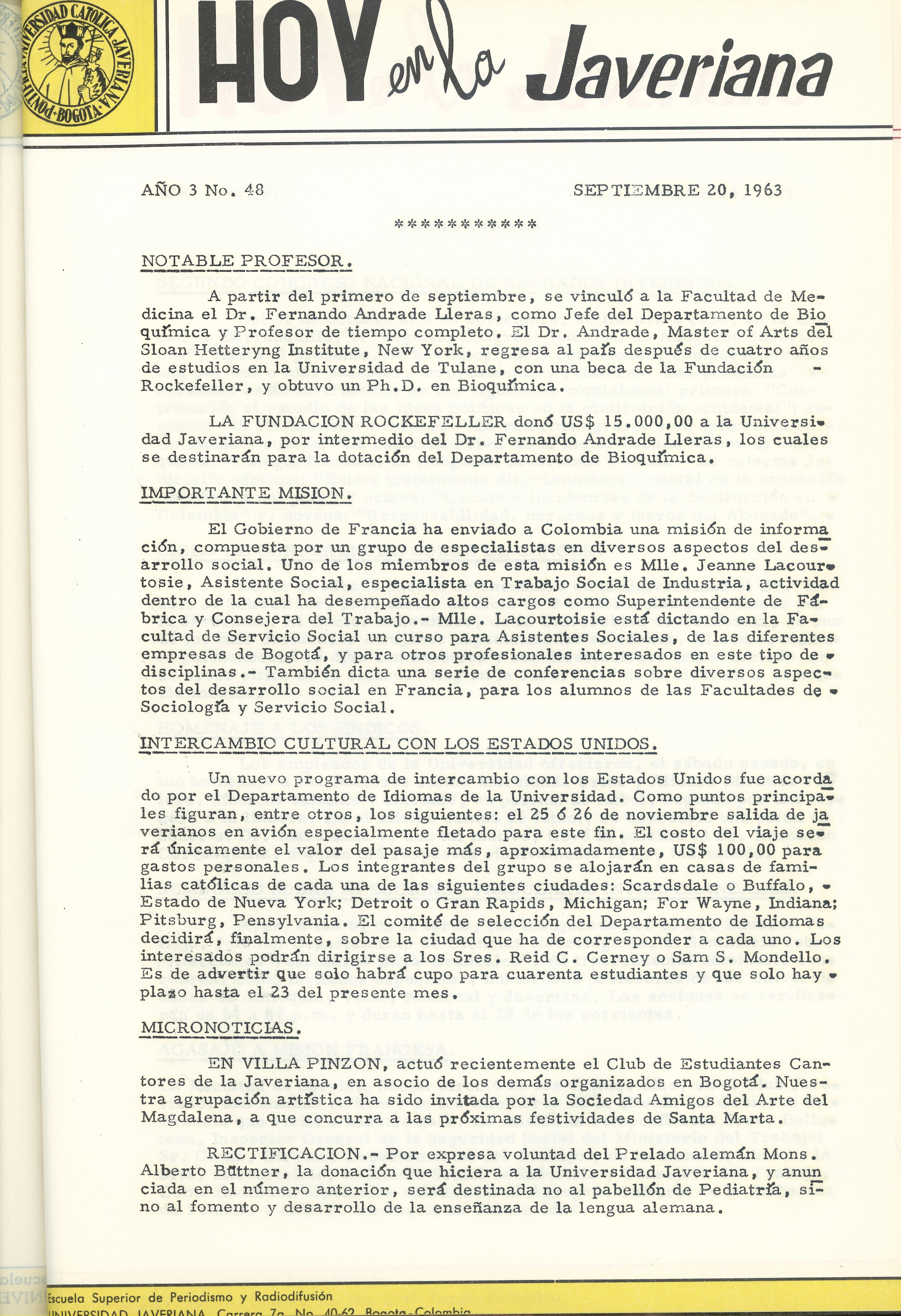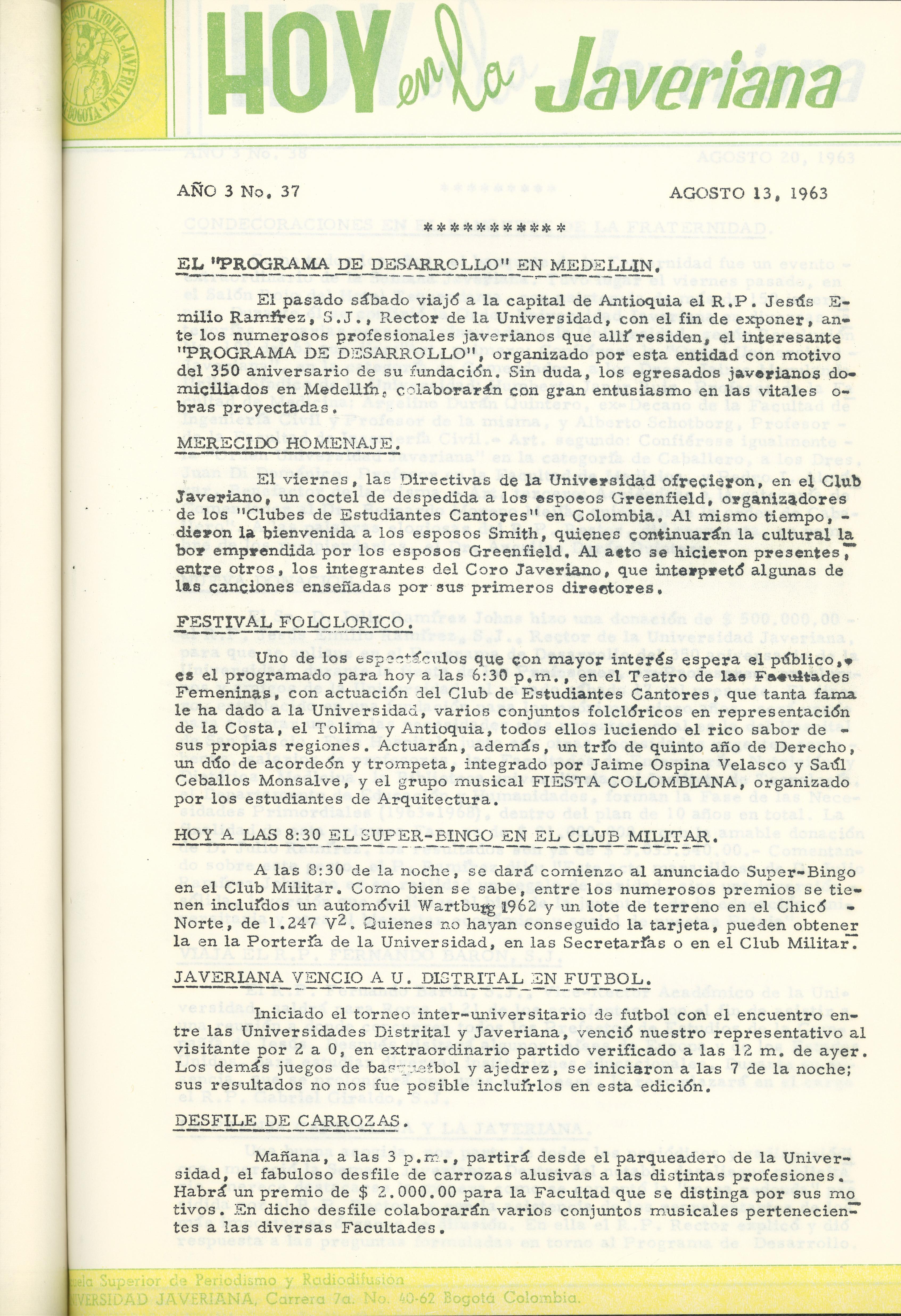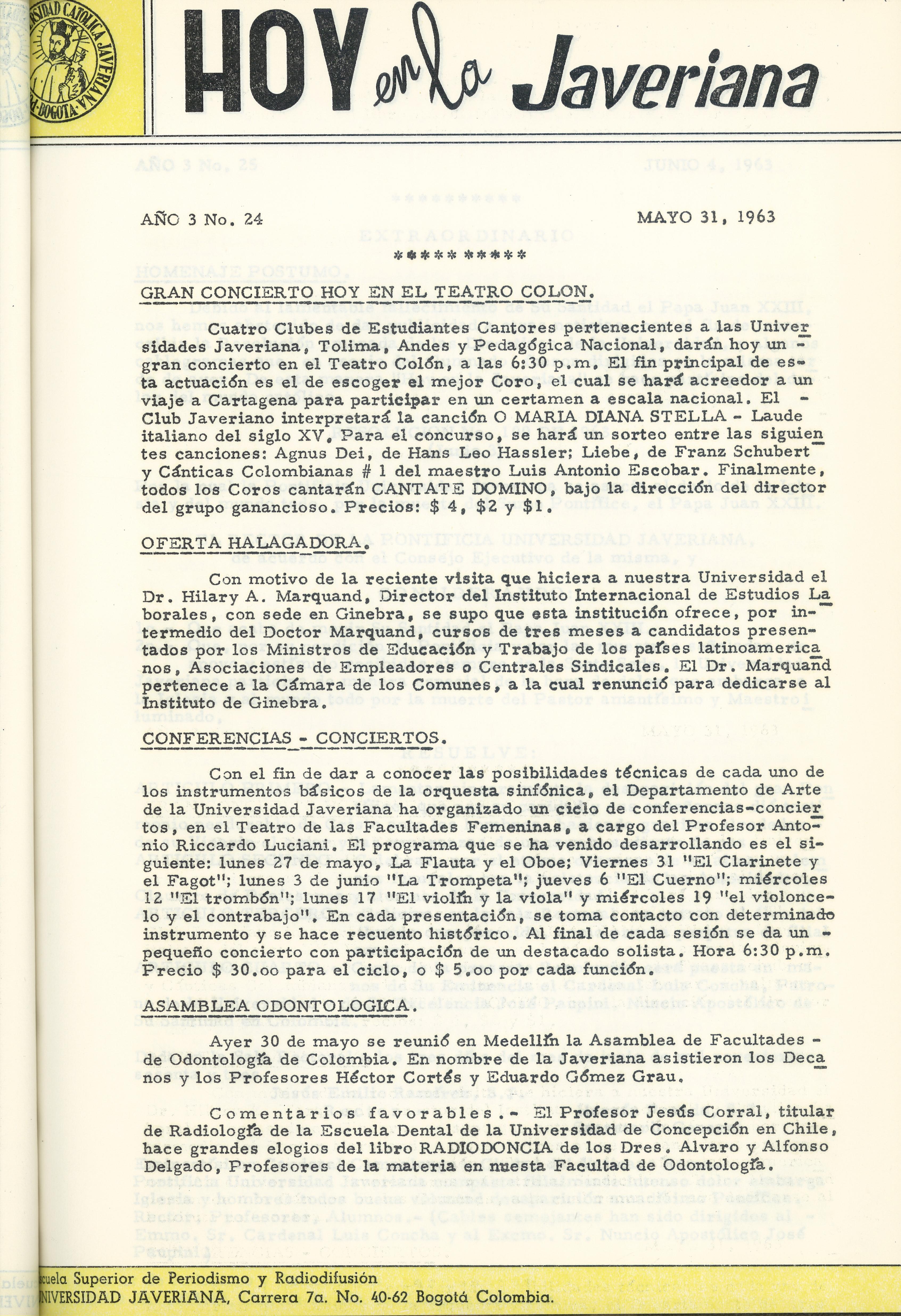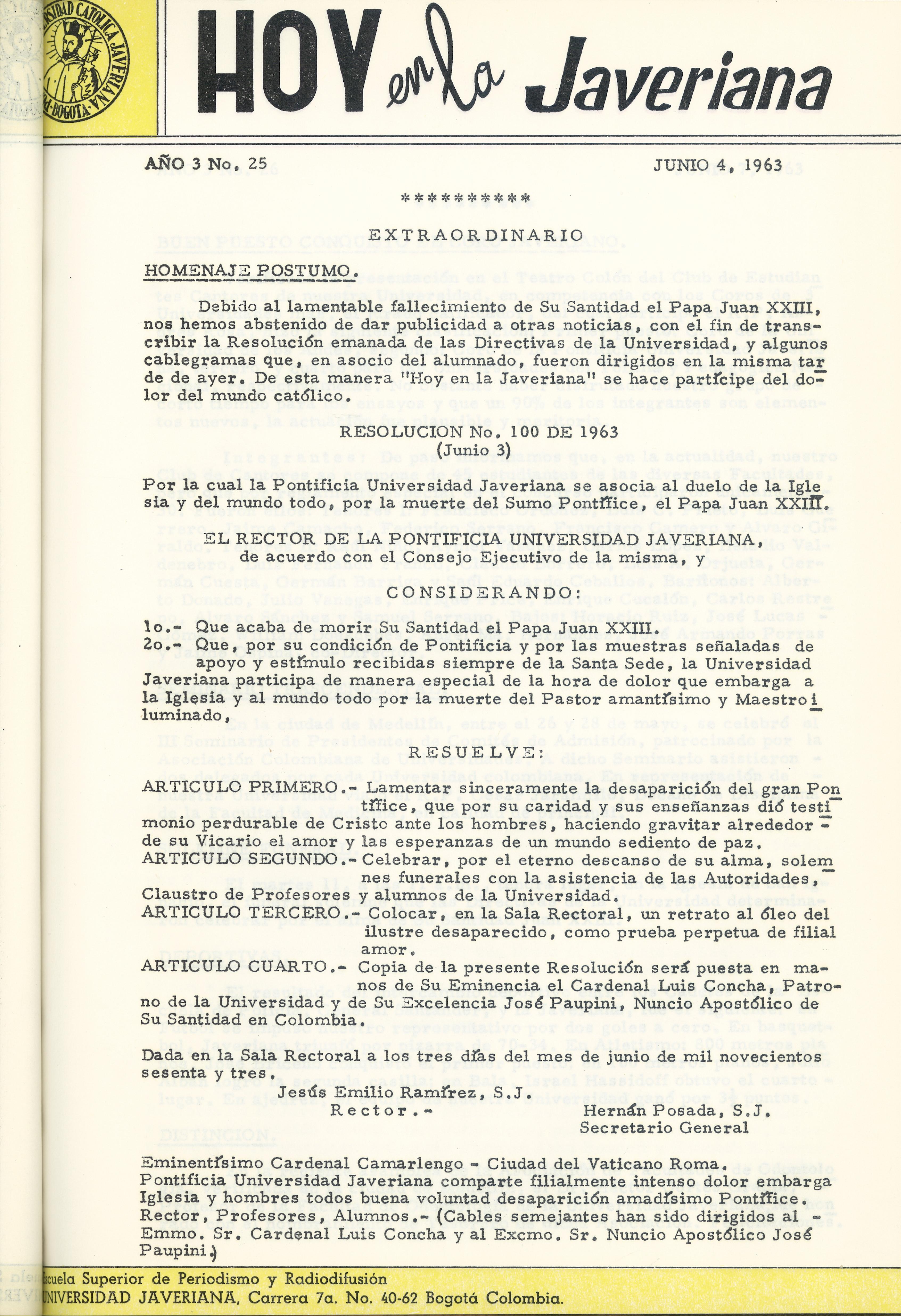 Asf 1o comunicd el Jefe del Servicio de CoorCinacidn y Vigilancia U niversitaria, Vicente Bejarano Manrique, al R.P. Rector de Ia Jáverianal Dice La nota en r:aención: ItTengo eI gusto de enviarle las siguientes providencias relacionadas con unidades docentes de esa Universidad: ACUERDC No. 4t-, - Fcr el cual el Comitá Administrativo <ie la Asociacidn Colornbiana Ce Universidacles le irnpartid su aprobacidn al nuevo plan de estudios de la Escuela §upericr de Periodismo y Radiodifusidn, el cual fue aprobado pcr el Ministerio de liducacidn Nacional, en virtud de la llesolucidn No. 3537de 7 Ce r:ctubre Ce 1963".- |IACUTIRDO No. 45 - For eI cual el misrno Con.ité aprcbdr Brr fornra definiti.va, Ias Escuelas de S,IRVICIO SOCIAL e INV"E;I'XIGACIIN §CCIAL, dependientes de la Facultad de Ciencias Sociales de esa Universidad. Este Acuerdo fue aprobado por el fuIinisterio de Educaci6n, segrfn liesolucidn 3535 Ce cctubre 7 del presente a'ñ.or'.- Adjunta a las cita.das prcvidencias, llegá a la R"ectorfa copia del inforrne de Ia visita de carlcter acaddrnico practicada pcr el Dr. Josd Manuel Rivas Sacconir €r1 el cual ce hacen algunas recoroendaciones.