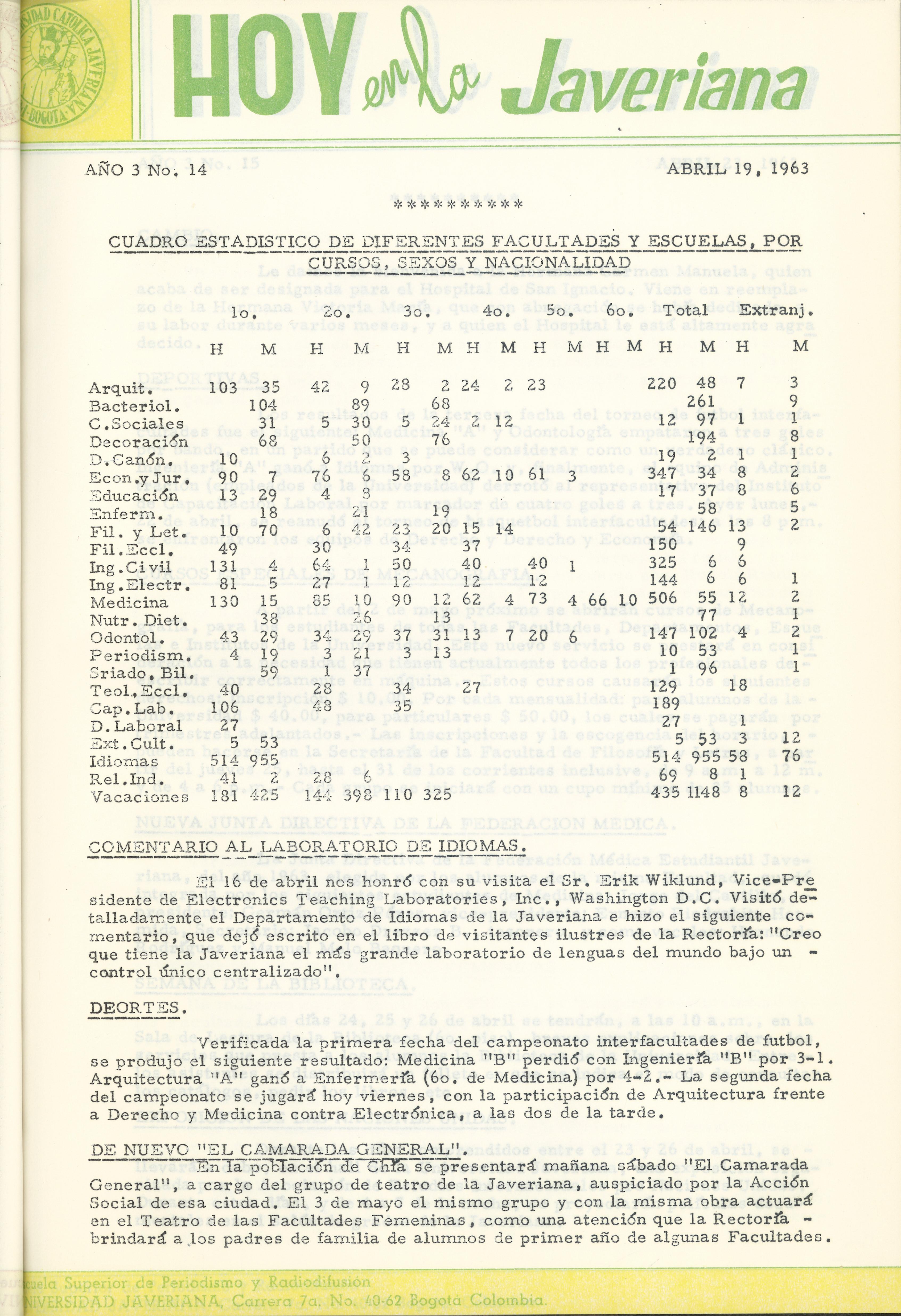 Quinientos ochenta y dos estudiantes terminan sus estudios profe- glonales en la Universidad Javeriana este año, formando eI nrfrnuro *is alto de egresados anuales en toda Ia historia de la Universid,ad. Estos, con sus tt¡entes sabiamente preparadas y dirigidas, van a prestar a1 pueblo colombia no un beneficio incalculable.. De aquel número, l9-son d.e Arquitectura , 56 7 {g.Arte y Decoracidn, 34 cle Capacitacidn Laboral (Construc"i¿t , y Topogra- ffb), la *e Ciencias Sociales, B de Derecho Candnico , 62 de Derecho , n au Econornfa, Z0 de Enfermerfa , 34 de Filosoffa Eclesiistica, Z? d,e Filosoffa y-Letr_as, 4L de Ingenierfa Civil , 1Z de Ingenierfa Electrdnica , Tg de Medi!!na t 27 de Odontologfa , L7 de Periodismá, 34 de Relaciones industriales, 38 de Secretariado Bilingüe y i!,7 de Teclogfa, De las Facultades de Nutrigidl y Dietdtica, Ciencias de la Educacidri y Bacteriologfar ho saldrdn pro- fesionales este año, yd que fueron prolongad.os por rrn aáo rnds los progr&mas de estudios respectivos