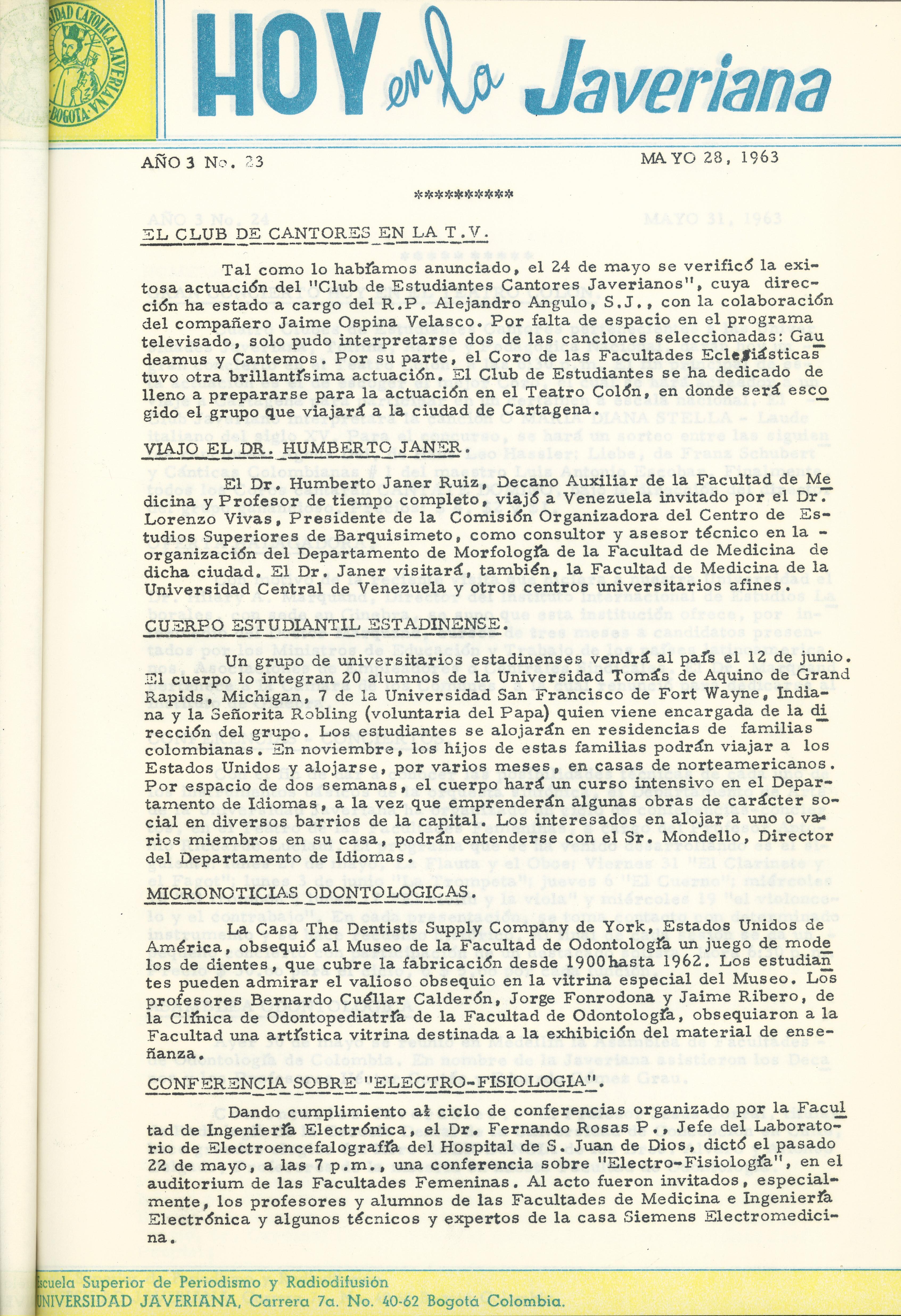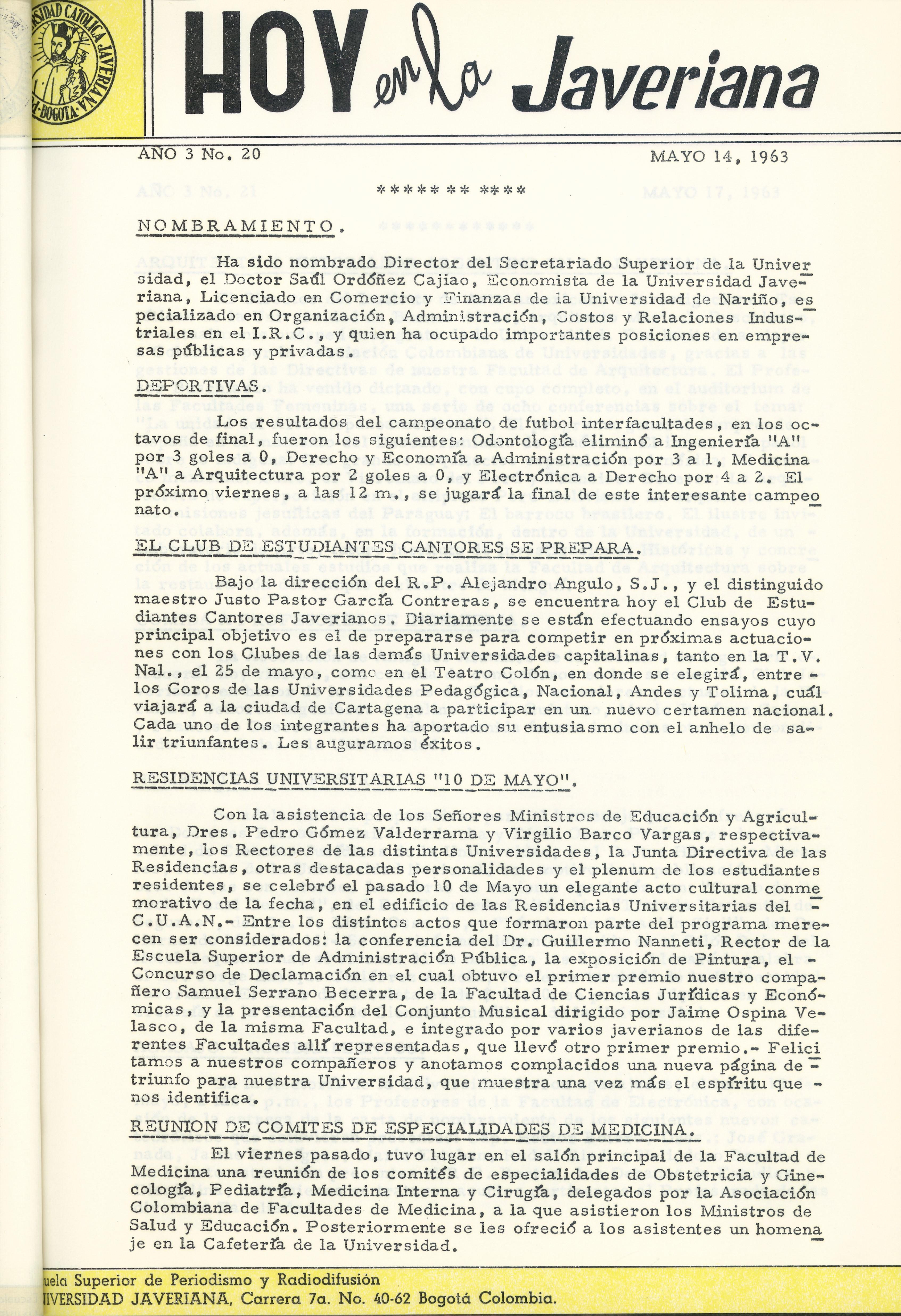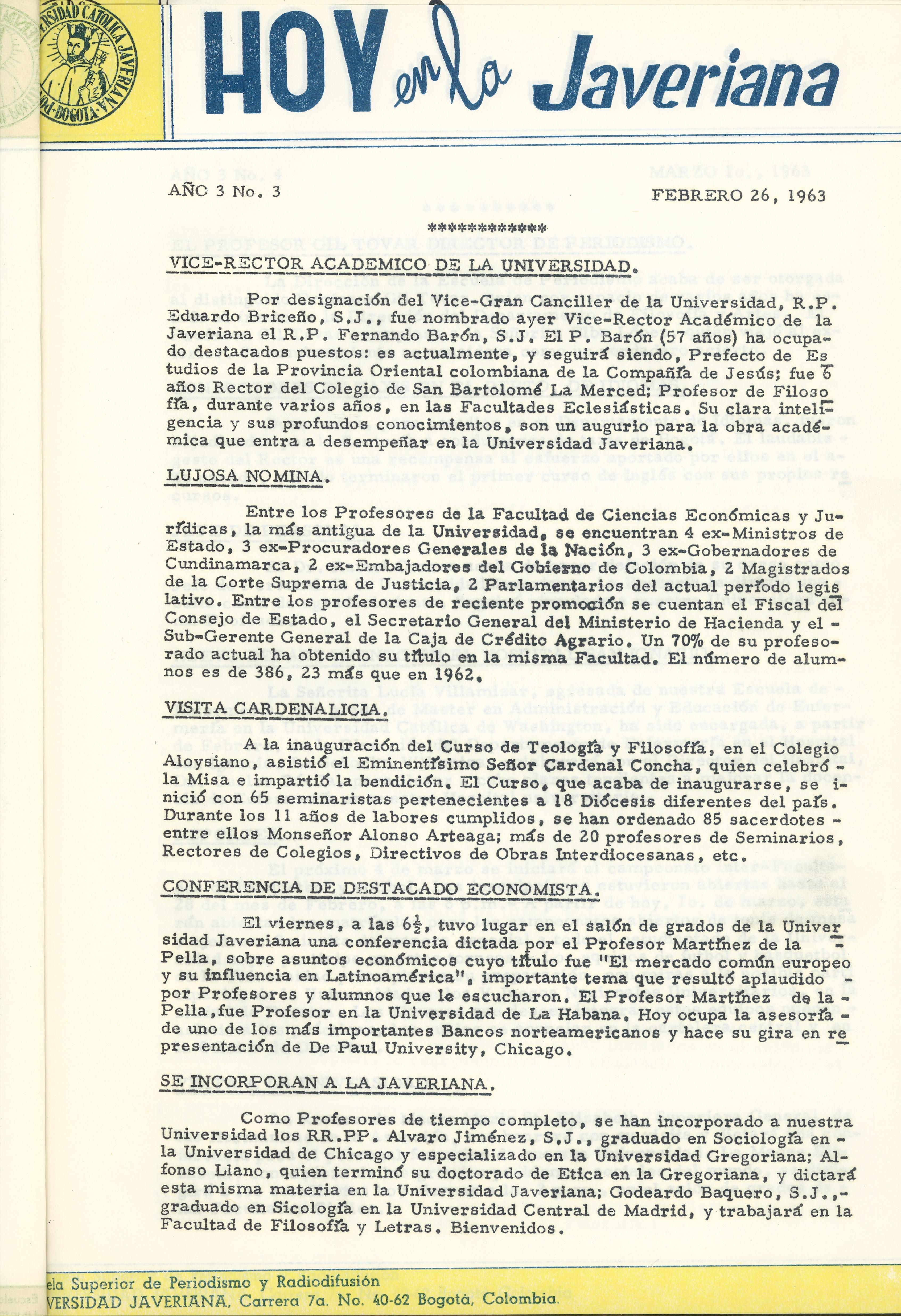 La Rectorfa de Ia Universidad Javeriana acaba de hacer llegar cartas de nombrarniento a las siguientes personas: Rarndn Baez, Profesor AuxiJ.iar del Laboratorio de Materiales Dentales de la tr'acultad de Odontologfa; Oscar Wiltiamson, Profescr Auxiliar de Radiolo Eta, Facultad de Odontologfa; A1berto Cárdenas Ilscovar, Profesor y Jefe de1 Departamento de Ginecol.ogfa y übstetricia de la tr'acultad de Medicina y el Hospital San lgnacio; Jorge ¡, Yamhure , Profesor Auxiliar de Morfologfa Dental; Pablo Bernal, Profesor Auxiliar de la Cátedra de Tumores, Facultad de Odontologfa; Eduardo Borda Camacho, Jefe de1 Departamento de Pediatrfa, Facultad de Medicina; Edmond Chediak, Profesor Auxiliar de la Cátedra de Tumores, tr'acultad de O d.ontologÍ?u Humberto Janer , Decano Auxiliar de Ia Facultad de Medicina, T para desernpeñar la'Direcci¿ln y Coordinacidn de los Departamentos de Cien liau Básicai; Roberto Arango danfn, Jefe de1 Servicio y Profesor de OrtopE dia y Traurnatologfa de1 Hospital de San lgnacio y Facultad de Medicina.