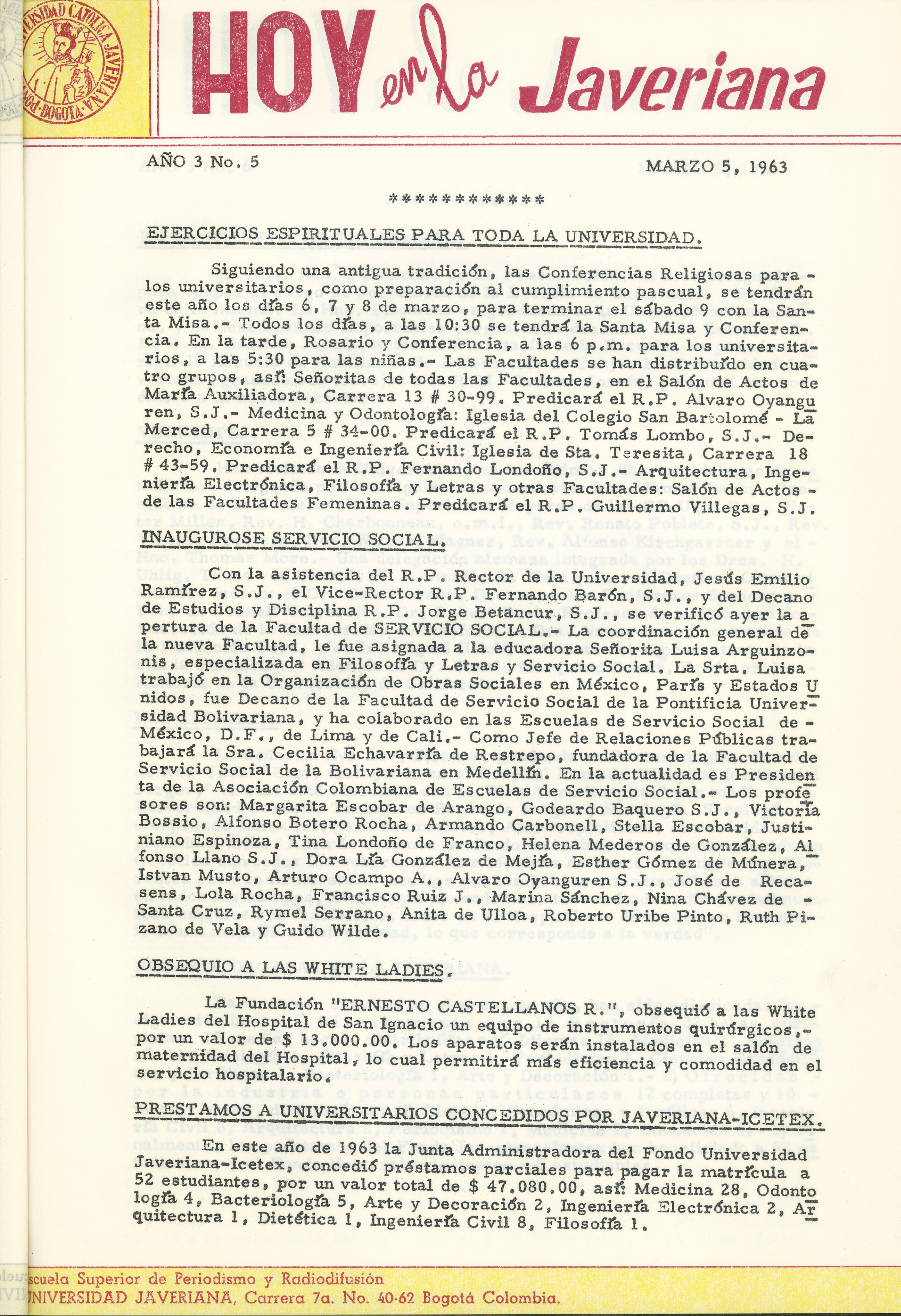Con Ia asistencia del R.P. Rector de la Universidad, Jesüs Emllio Rarnt'rez, S.J., eI Vice-Rector R¡P. Fernanao gaid;r§.i. r-y;;i ñl.r"o de Estudios yDisciplhl R;I . lo¡_Se p_etáncur., §.J., áu tr*rífí"C;y;;la a pertura de la Facultad de SERVICIO SOCIAL.- LEr coordinación g*í*rr1 dA- la nueva Facultad, le fue asi-g--""q a la educadora Señorita Luisa"Arguinzo- It"f ls-neci'alizada en F ilo"of-fa y Letras y Servicio Social , La Srta. Luira trabajd en la Organizacidn de oÉras sociátes *r, turg"i;;;-É;ft v-glt"áos U nidos, fue Decano de la Facultad de Servicio Social de la Pontificia Urrir"r: eidad Bol'ivariana, y ha colaborado en las Escuelas de Servicio Social d,e - Mdxico, D.Fr r de Lima y de Cali.- Corno Jefe de Relaciones prtUiicas tra- bajará Ia §ra. Cecilia Echavarrfa de Restrepo, fundadora de la Facultad de Servicio §ocial de, la Bolivariana en Medellfii. En la actualidad es Presiden ta de la Asociacidn Colombiana d,e Escuelas de Servicio Social.- Los p;;#' sore§ 8on: Margarita Escobar de Arango, Godeardo Baguero S.J. ¡ Victofla Bossio, Alfonso Botero Rocha, Armanáo'Carbone1l, Steila Escobai r' ilEti- niano Espinoza, Tina Londoño de Franco, Helena Med,eros de Gon ri¡*r, Al fonso Llano S.J. r Dora Lfa Gonl.*Lez de ivlejfa, Esther Ce*ur;;-Mri;;;";t- Istvan Musto, Arturo oca¡,npo A. r Alvaro cyanguren s.J. ¡ Josd de Reca- sen§, Lola R9cha, FrancisCo Ruia J. r"fufarírr. §ánchez, ¡gina Chávez áe§anta Cruz , Ryloel Serrano , Anita de U1loa, Roberto Uribe pinto , Ruth piz,aln.o de Vela y Guido Wi1de.