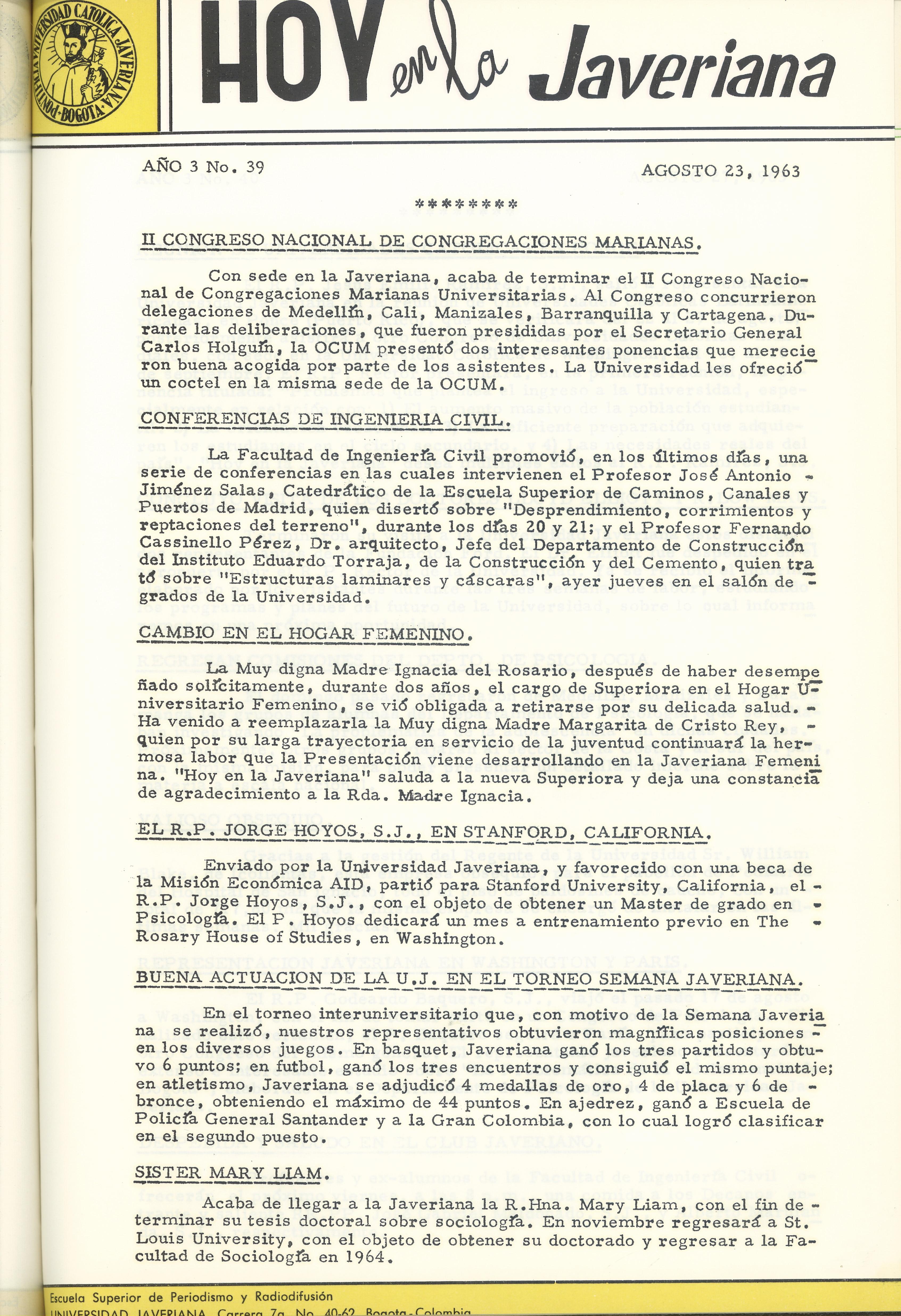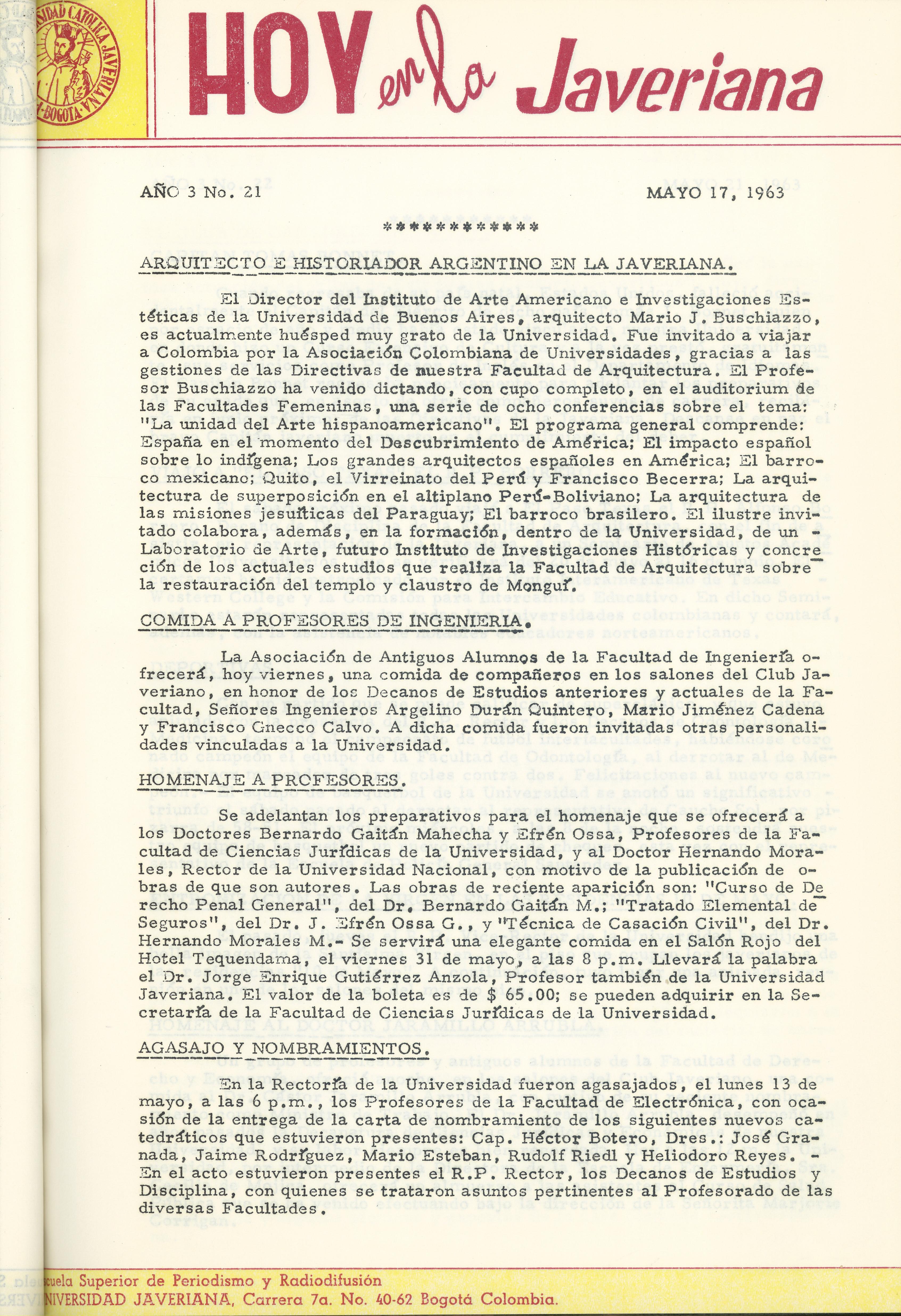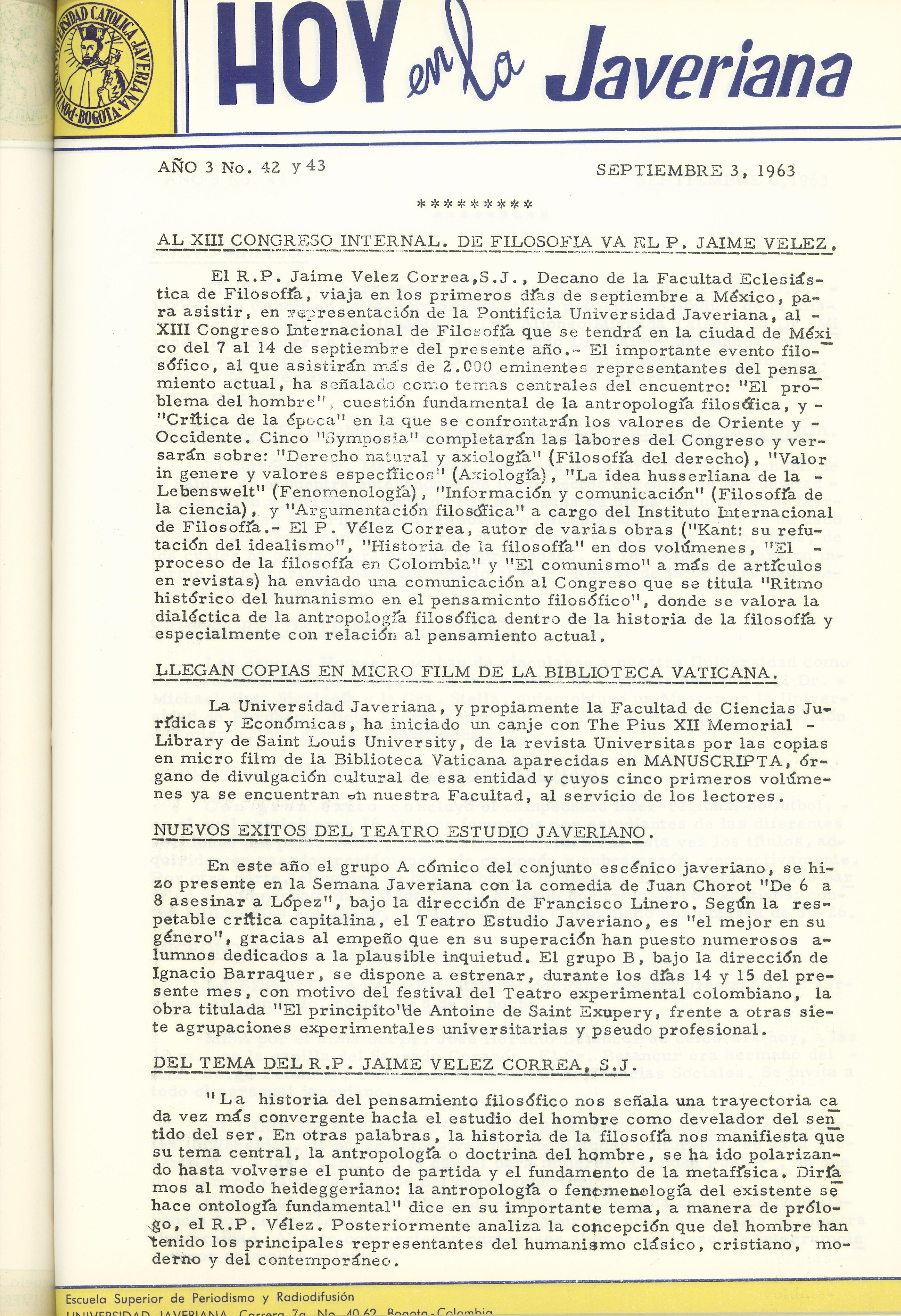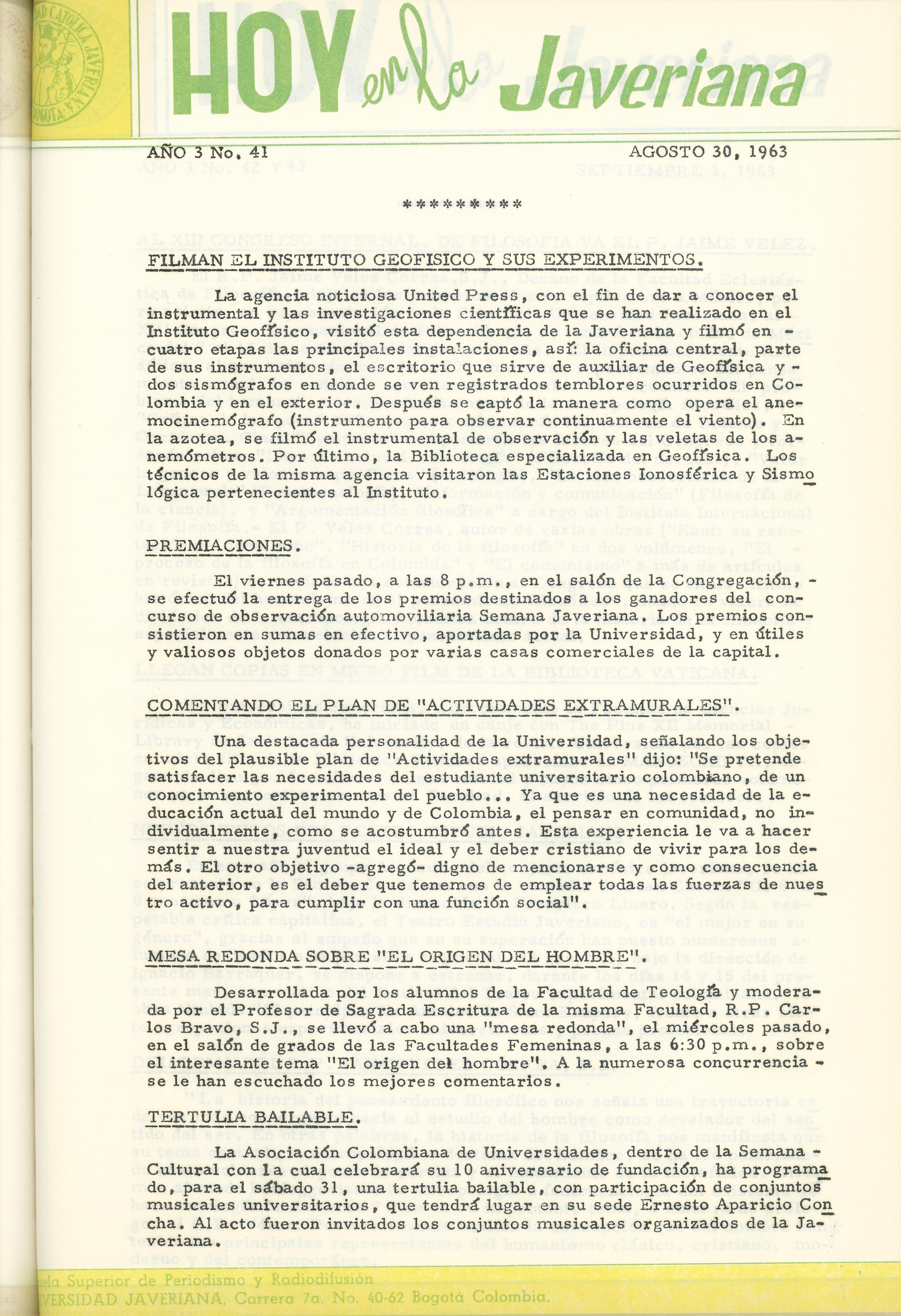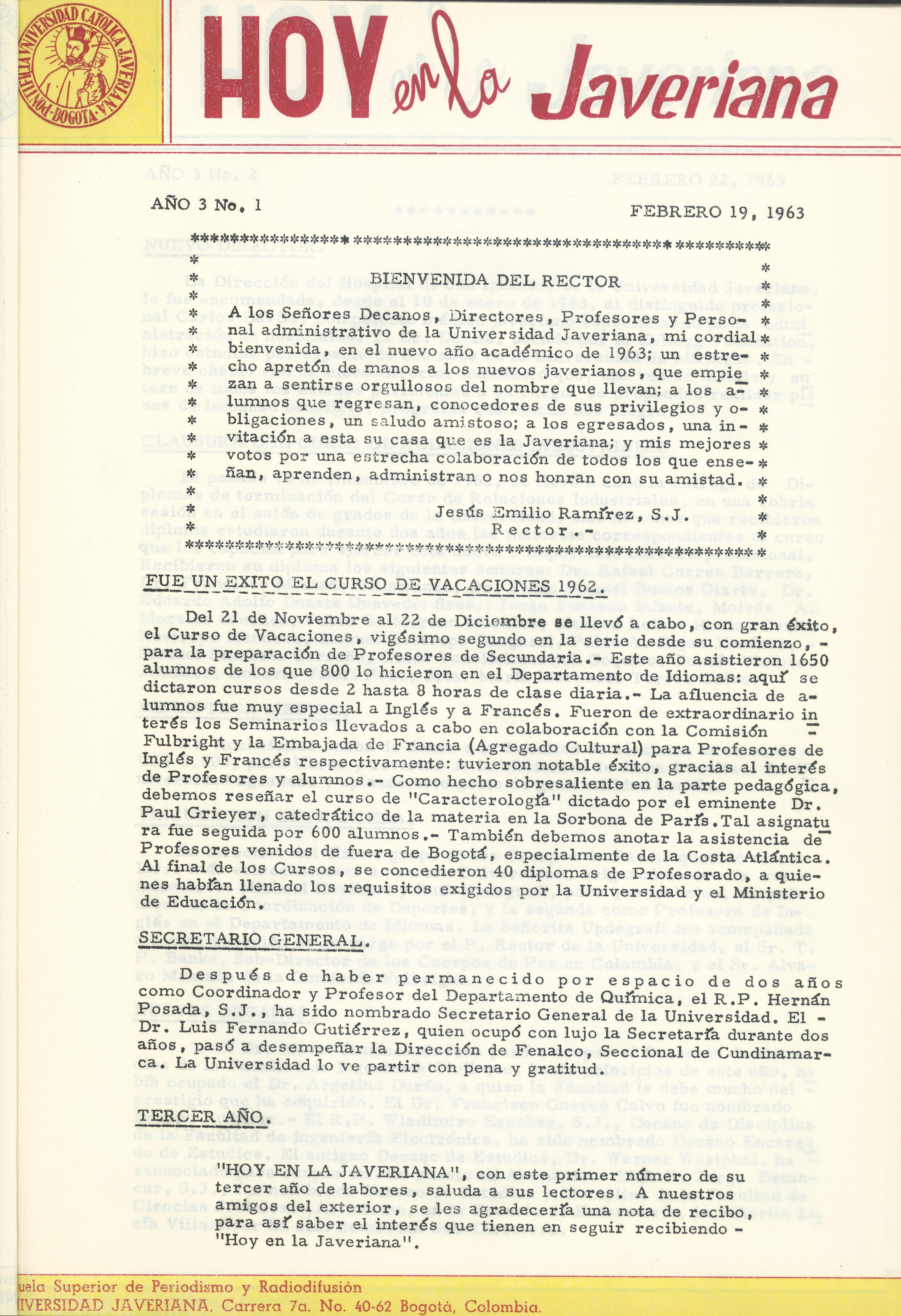TSECES. *ñor,. ¡rHoY EN r-A JAVERIANA'' r con este primer ntfrnero de su tercer año de labores, saluda a sus 1dctores. A nuestros amigos de1 exter-ior, s9 les agradecerfa una nota de recibo, plfa asf saber eI interds gue "ti"rrun en seguir recibiend.o - ttHoy en la Javerianárr.