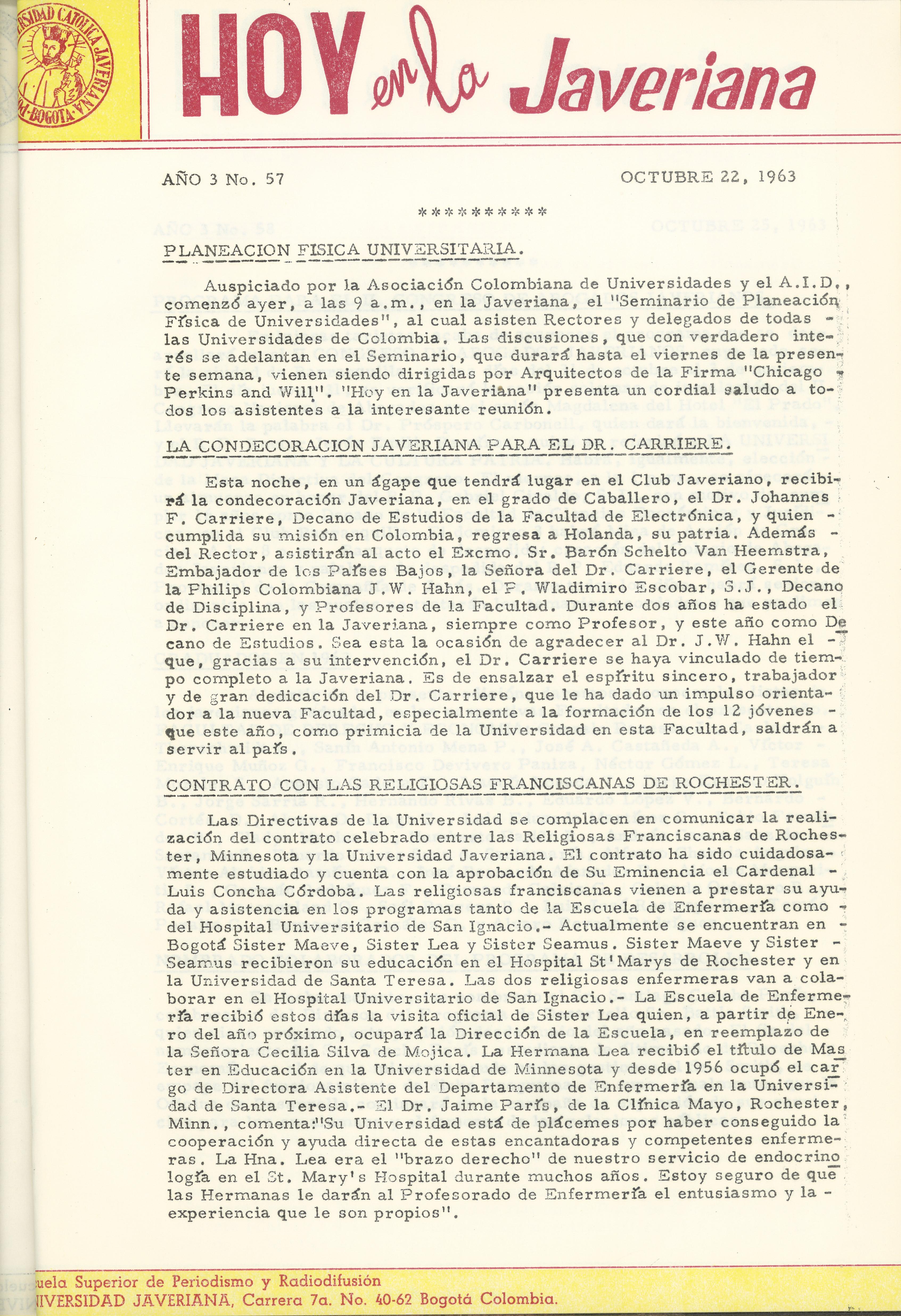 Las Directivas de la Universidad se complacen en comunicar la realizacidn de1 contrato celebrado entre las Religiosas Franciscanas de Rochester, Minnesota y la Uriiversidad Javeriana. §t contrato ha sido cuidado§&- i mente estudiado y cuenta con Ia aprobacidn de Su Eminencia el Cardenal -.. Luis Concha Cdrdoba. Las religiosas franciscanas vie¡ren a prestar sü af'uda y asistencia en los programJs tanto de la Escuela de Enfermerfa corno ? del Hospital Universitario de San lgnacio.- Actuaknente §e encuentran en : Bogotd Biut", Maeve, Sister Lea ySiut*r Searnus. Sister Maeve y SisterSeam.us recibieron su educacidn en el Hospital Str Marys de Rochester y en' la Universidad de Santa Teresa. I-as dos religiosas enfermeras van a colaborar en el Hospital Universitario de San lgnicio.- La Escuela de Enf€rrrrerfa recibió estos dfas la visita oficial de Sister Lea quien, a partir dp Ene-" ro del año prdxirno, ocupará Ia Direccidn de Ia Escuela, en reerrlplazo de la Señora Cecilia Silva rle Mojica. La Herrrrana Lea recibió el tltulo de Mas ter en .tlducacidn en la Universidad de Minnesota y desde Lg56 ocupd el cafl go de Directora Asistente del Departarnento d.e Enferrnerfa en la ÚniversiT: da,J de Santa Teres&.- lll Dr. Jairne Farfs, de la Clfnica Mayo, Rcchester, Minn. , cornenta:ttSu Universidad. está de plácernes por haber con§eguido la' cooperación y ayuda directa de estas encántadoras y competentes enfermeras-, La Hna, L"a era el ttbrazo derecho" d.e nuestro servicio de endocrinol logfa en el §t. Maryt s Hospital Curante :'nuchos años. Estoy seguro de qul Iaá Hermanas le ¿arán al Érofesorado de Enfermerfa eI entusiasmo y laexperiencia que le son propiostt
