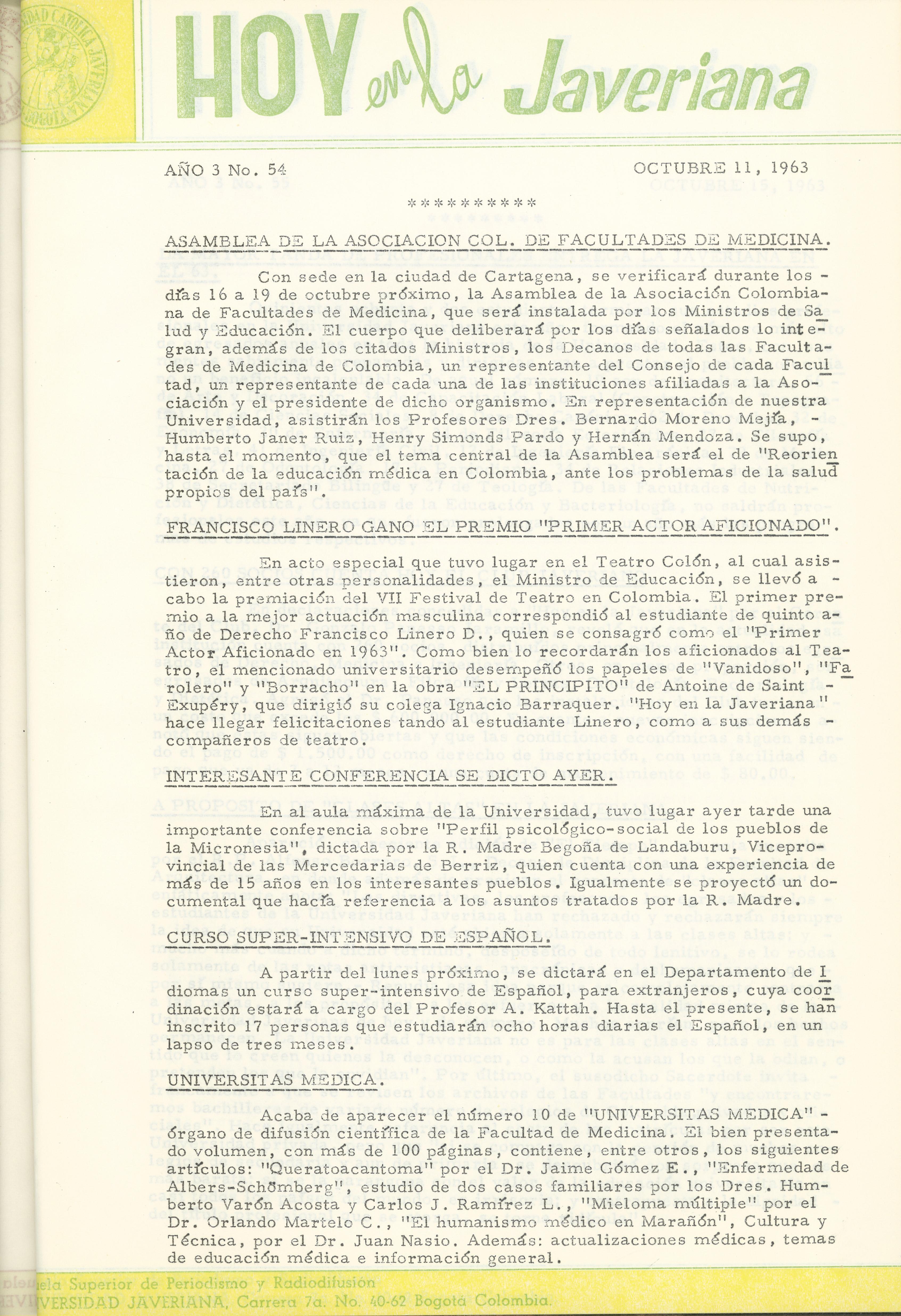 En actc especial que tuvo lugar en eL Teatro Ccldn, á1 cual asistieron, entre otras perscnalidades, el ivfinistro Ce Educaci-dnr se llevd a cabo la pre,aiacidn CeI VII Festival cle Teatrc en Colornbia. -rII prirner prerrio a la rnejor actuacidn n"r.¿lsculina corresp*ndid al estudiante de quinto año de Derecho Francisco Linero D,, quien se consagrd cornn el'rPrirner Actor Aficionadc en I963r'. Corno bien 1o recordarán los aficionad.os aI Teatro, el rnencionado universitario deserrrpeñ6 los 1:apeles de trVanidosotr, ttFg rolerort y tt'8,\rrachc¡rr en Ia obra ":iL PB,INCIPITOTTde Antoine de Saint ilxupdry, que dirig'i.6 su cclega Ignacio Earraquer, "Hoy en la Javerianatt hacá ttugar felicitacir:rres tanal¿: ál estudiante Linero, corrrc a sus dernás ccrnpañeros ce teatro.