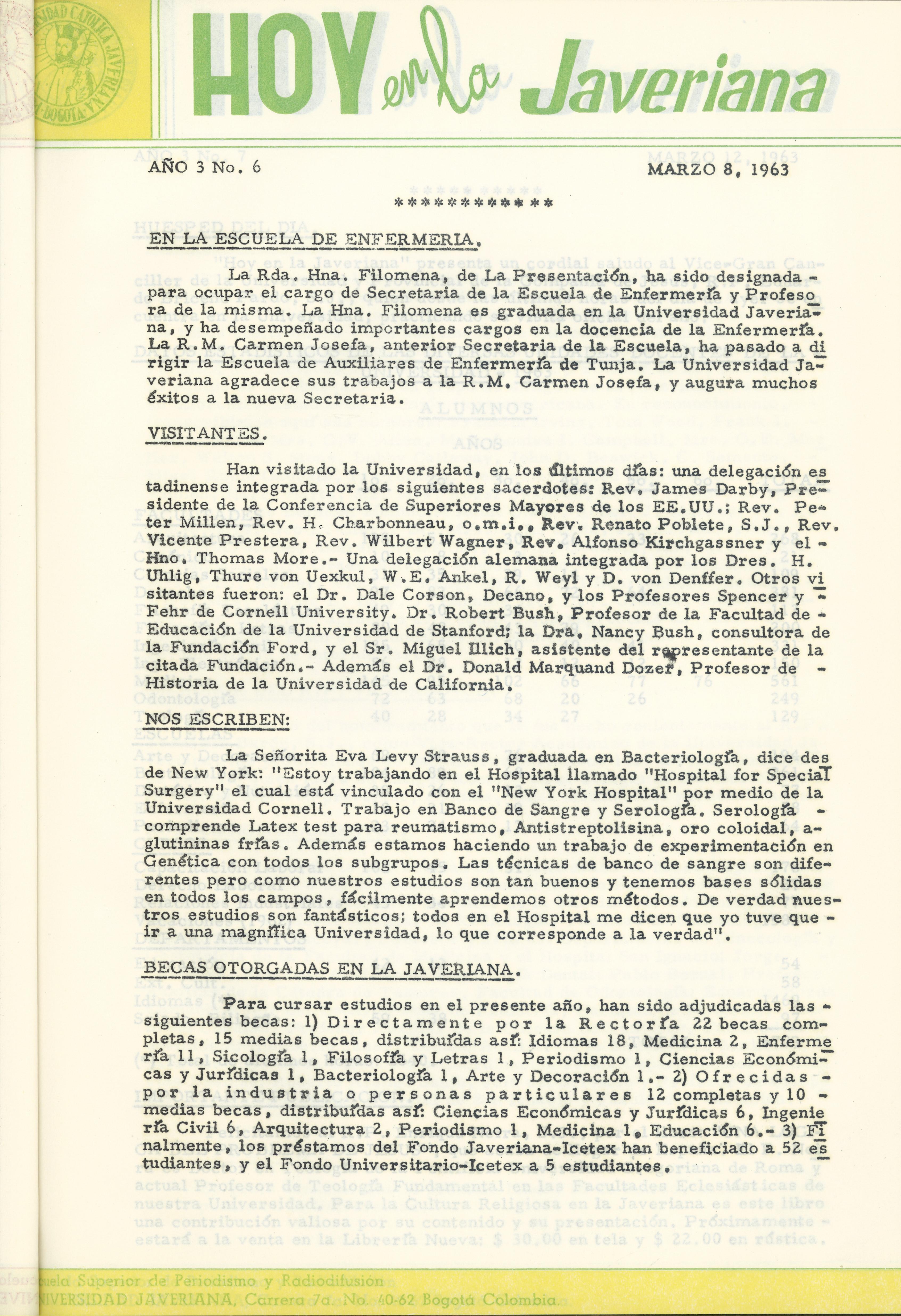 La §eñorita Eva Levy Strauss , graduada en Bacteriologfa, dice des de New York: rtsstoy- trabajando en el Hospital llamado ttHospital for Special §-urgery" el cual está. vineulado con el ttNew York Hospitaltr por medio de la Universidad Cornell. Trabajo en Banco de Sangre y Sérologfa. Serologfa icomprende Latex test para reumatismo, Antistreptolfsina, oro coloidal, r.r gfut+inas frfas. Además estamos haciendo un trJbajo de experimentacidn en Gendtica con todos los subgrupos. Las tácnicas de banco de-sangte son diferente§ pero corno nuestros estudios son tan buenos y tenemos bases sdlidas en todos los campos, fácilmente aprendemos otros mdtodos. De verdad ttuestros estudios son fantásticos; todos en el Hospital me dicen flue yo tuve guein a una magnlfica Universidad, Io gue corresponde a Ia veráadtt-.