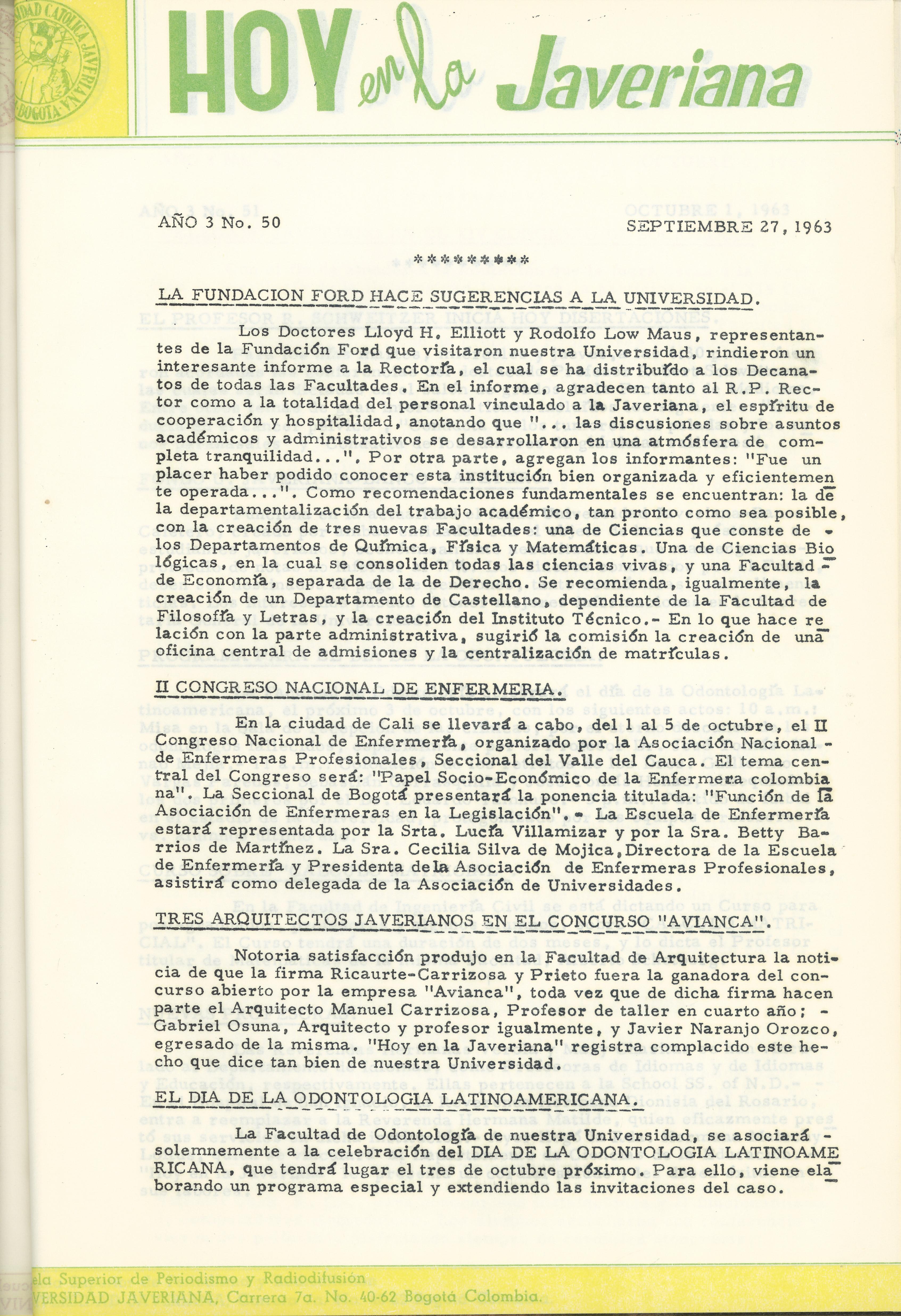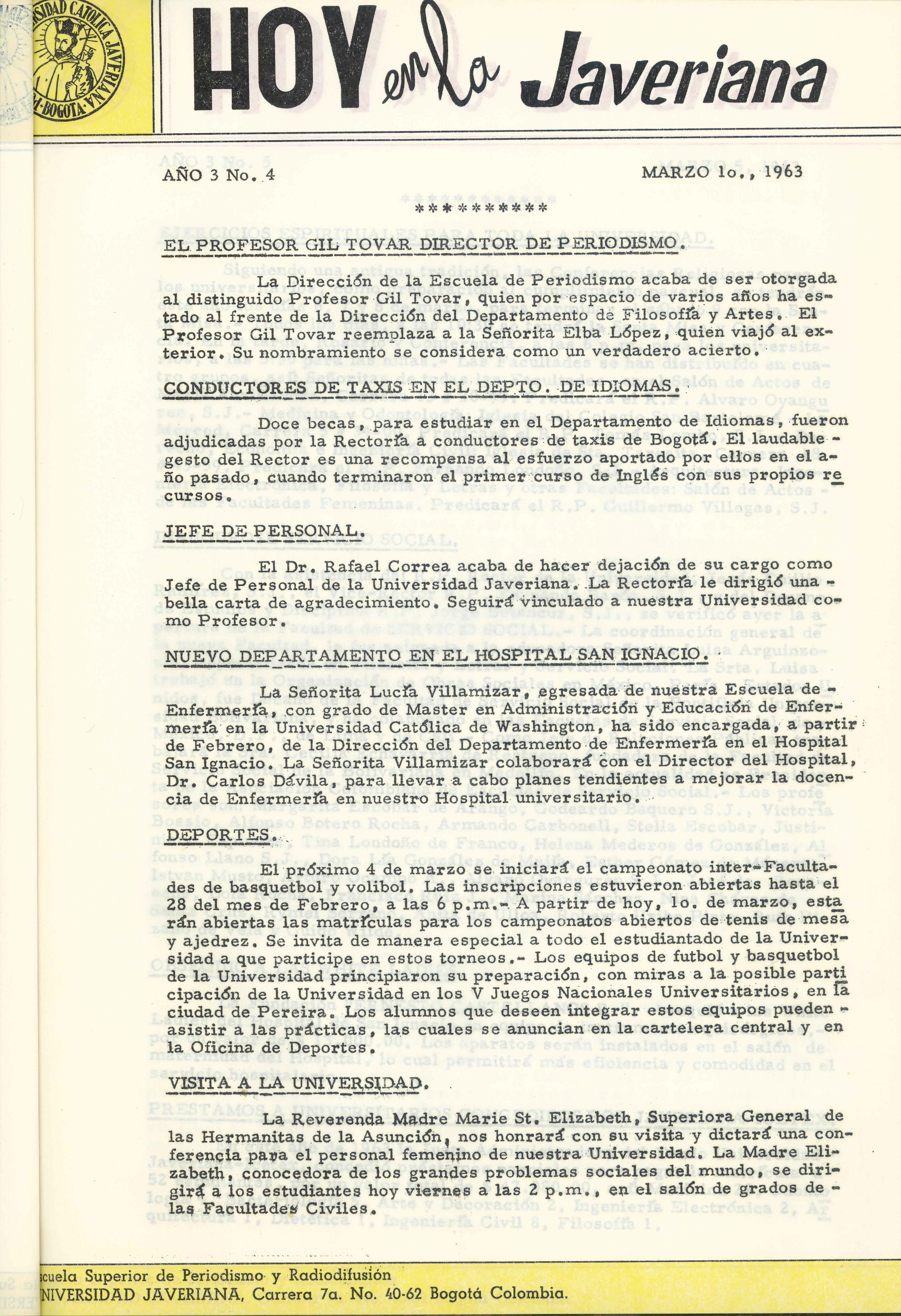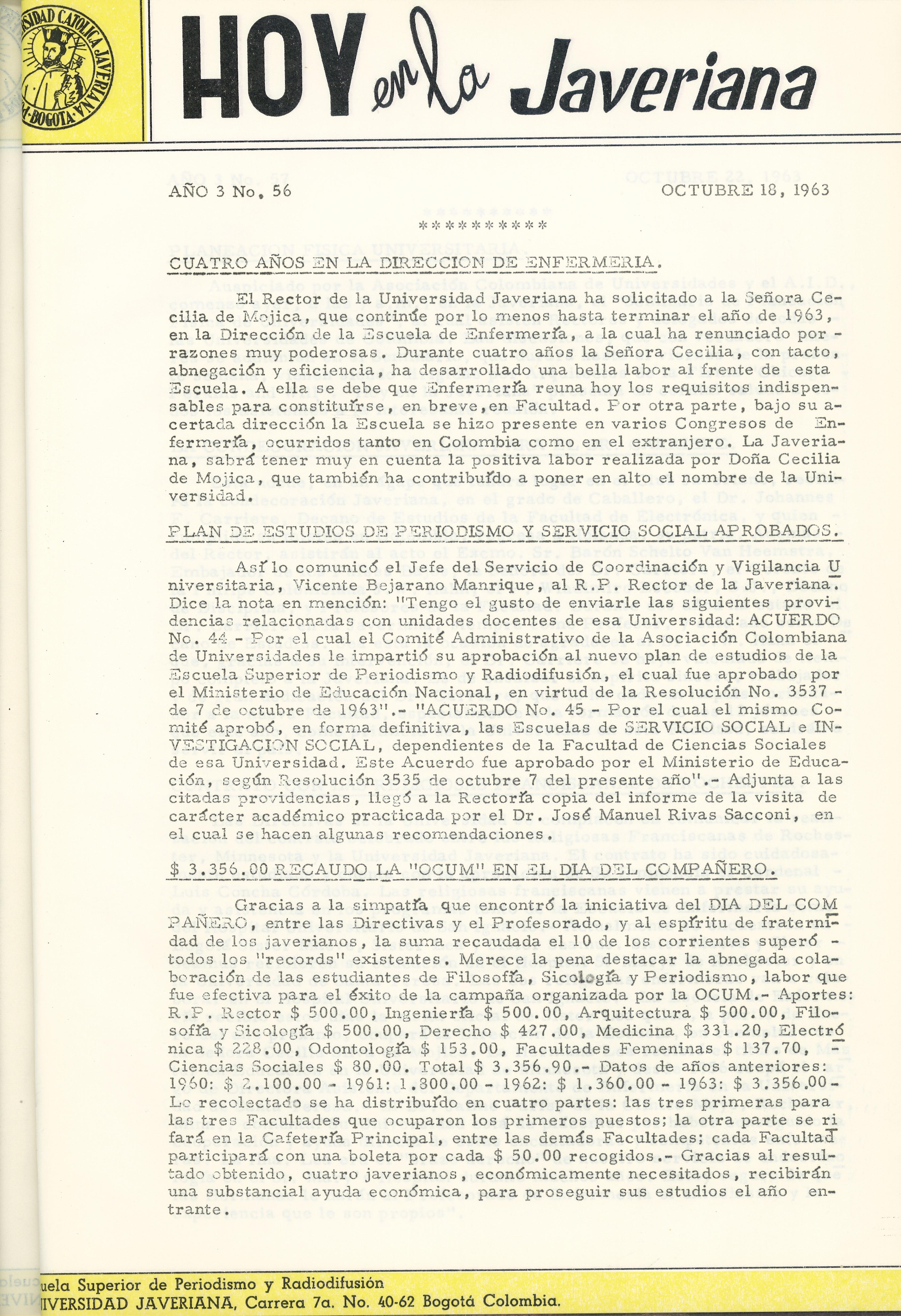 .El Rector de la Universidad Javeriana ha solicitado a la Señora Cecilia de lo.{cjica, que continrle por 1o menos hasta terminar el año de 1963, en la Direccidn de la Iscuela de tnfermerfa, a la cual ha renunciado porrazorres rnuy poderosas. Durante cuatro años Ia Señora Cecilia ¡ corl tacto ' abnegacidn y eficiencia, ha desarrollado una beIla labor al frente de esta Escuela. A ella se debe que -.lnferrnerfa reuna hoy los reQuisitos indispensables para constitufrse, en breve,en Facultad. F'or otra parte, bajo slt ?certada direccidn Ia Escuela se hizo presente en varios Congresos de tnferrnerfa, ocurridos tanto en Colombia conao en el extranjero. La Javeriao&r sahrá tener rnuy en euenta la positiva labor realizada por Doña Cecilia de Mojica, que tamhidn ha contribufdo a poner en alto eI nombre de la Universida,C.