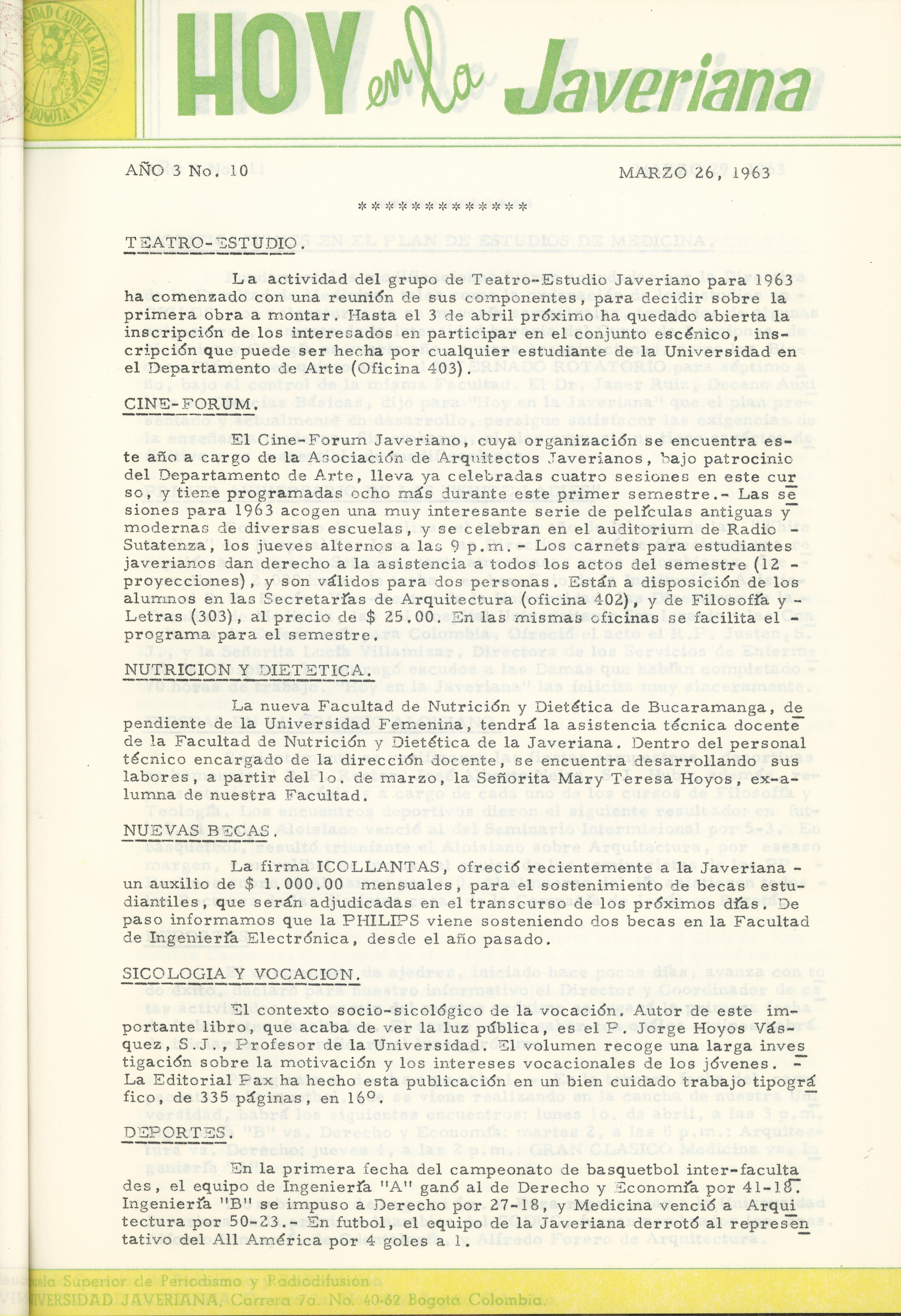 EI Cine- F'orurn Javeriano , cuya organización se encuentra este año a cargo cle Ia Atociacidn de.Arqriitectos Javeri.anos,l,:ajo patrocinic, del Departarnentc cle A.r:te, lleva ya celel.raCas cuatrc sesir:¡res en este cur so, y tiene prograrnadas ,:cho rnás Curante este prirner sernestre. - Las sE siones para 196 3 acogen una niuy interesante serie de pelfculas antiguas 1I rno*Lernas ,j.e diversas escuelas, y se celebran en el auCitoriurn de Radic Sutatenra, los jueves alterncs a las 9 p.§1. - Los carnets para estudiantes javerianos Can derecho a Ia asistencia a todc¡s los actos CeI sernestre (12 proyecciones), y son válidos para dcs personas, .Están a disposici6n de Ios alurrrncs en las Secretarfas de Arquitectura (oficina 4AZ)l, y de Filosoffa yLetras (303) , eI precio de $ 25.00. In las mismas cfícinas se facilita eLprograma para eI sernestre,